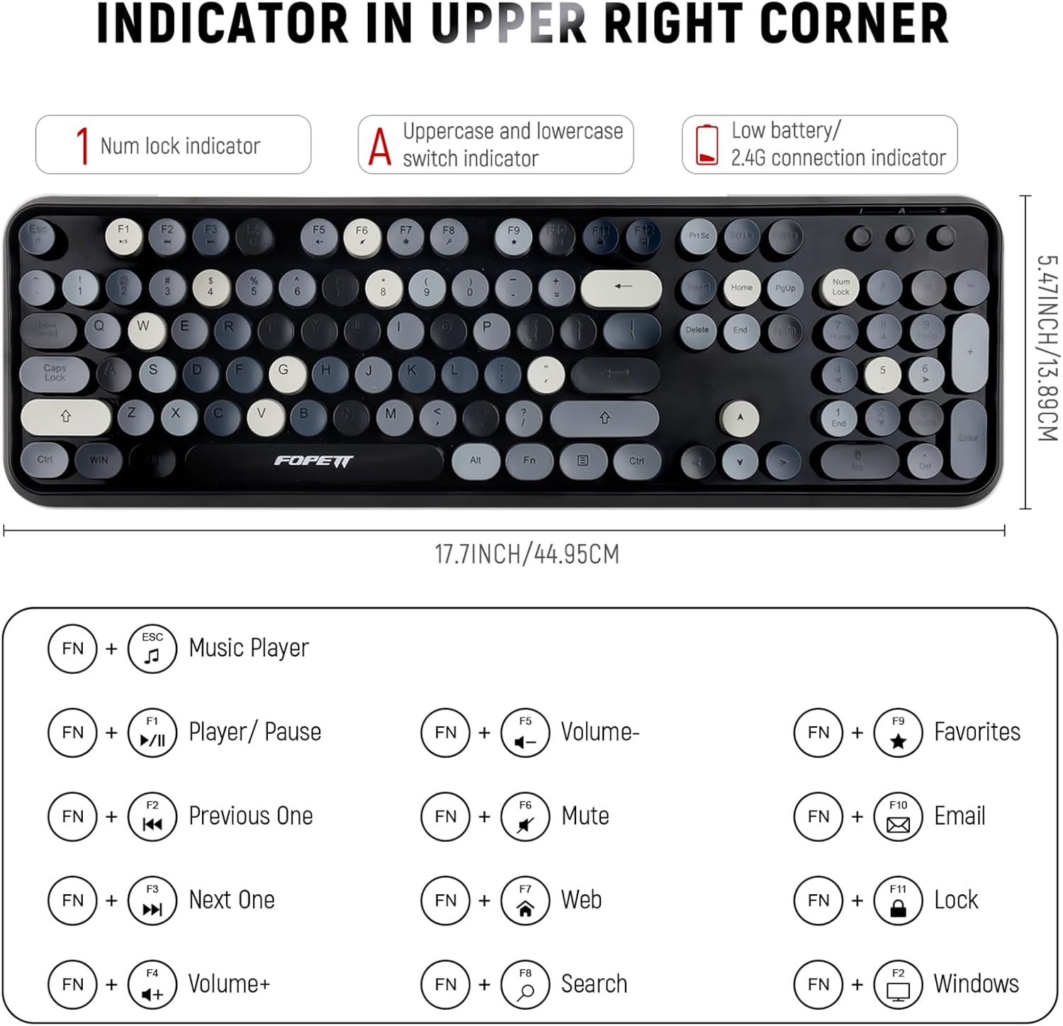 FOPETT Wireless Keyboard and Mouse Combo - 2.4G Full-Sized Cute Colorful Retro Keyboard with Round Keycaps 104 Keys Typewriter Keyboard for Laptop/Windows/PC - Grey Colorful