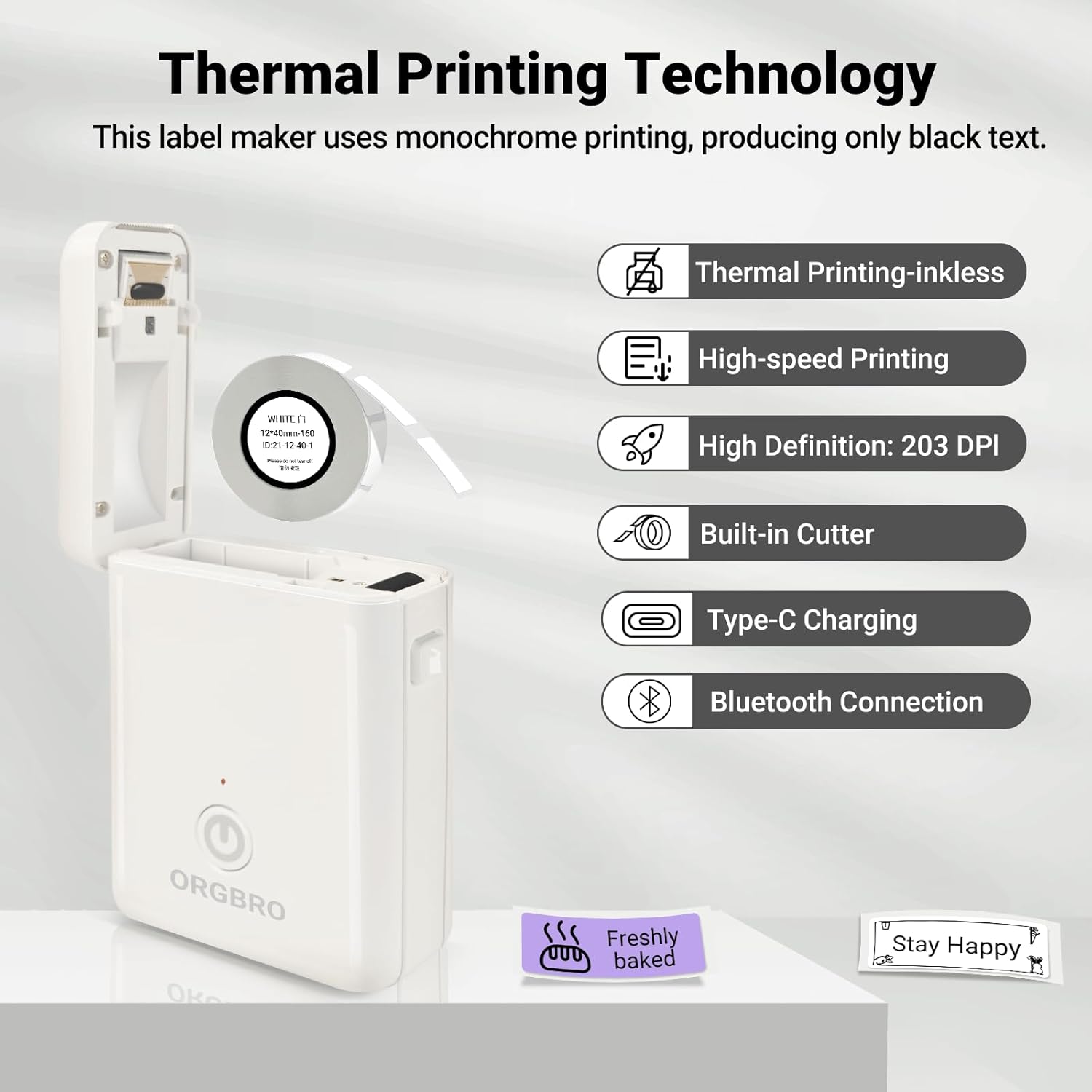 - Label Durability: ORGBRO label maker comes with a roll of 12 x 40 mm white pre-cut labels; ORGBRO labels waterproof, oil-resistant, and abrasion-resistant. No residue remains after removal; Supports continuous label paper (15 mm width) and fixed-length labels (12 x 40 mm); We recommend using ORGBRO thermal label paper for optimal print quality