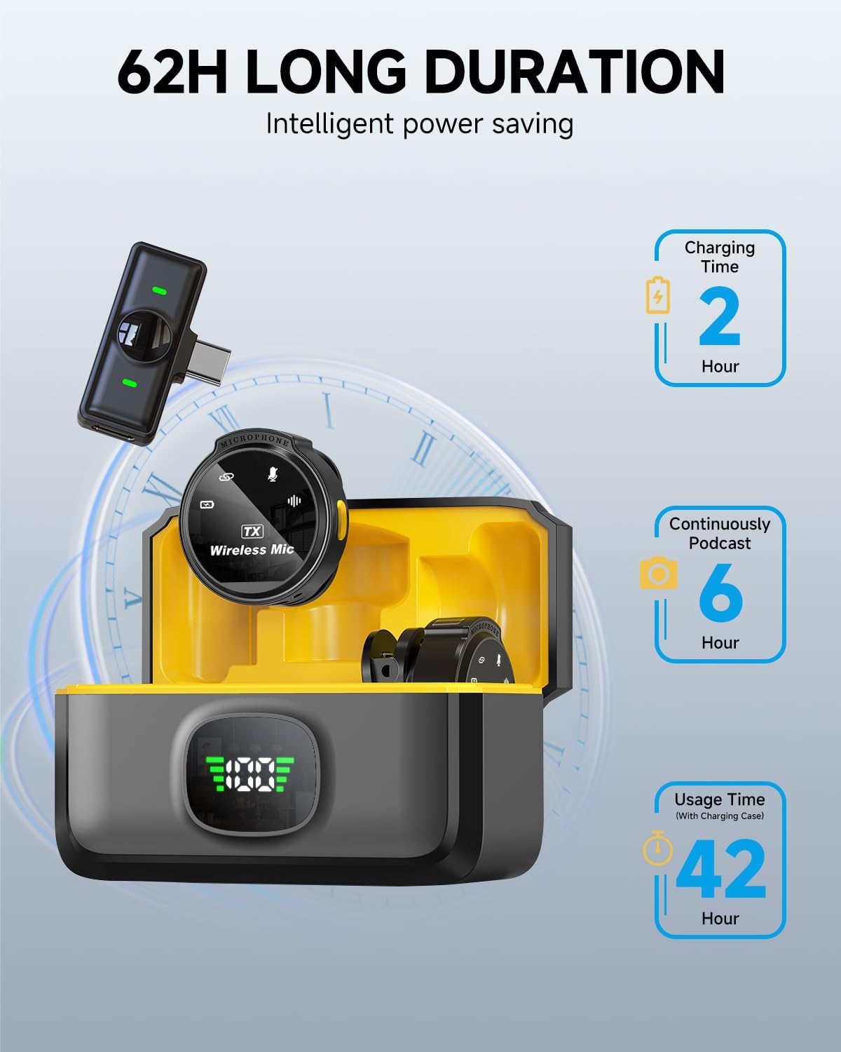 - 165FT Wireless Transmission & Rechargeable: This lavalier microphone boasts a consistent audio signal, capable of reaching a remarkable wireless transmission distance of up to 165 feet. Equipped with a high-quality DSP chip, it ensures even more stable transmission. The wireless microphone transmitter features a built-in rechargeable battery, offering up to 6 hours of operation on a single charge, or an impressive 42 hours with the charging case