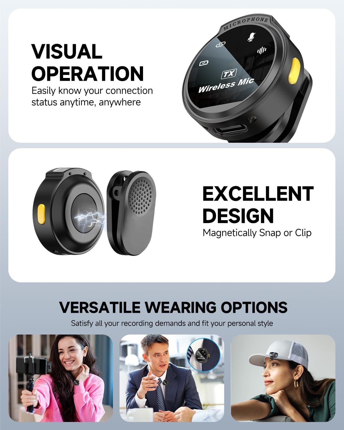 - Design for Professional: The Caiord J6 microphone boasts a 48kHz/24bit audio format for accurate sound capture. With a 60dB signal-to-noise ratio, it delivers excellent audio with minimal background noise. Plus, it can handle up to 95dB Sound Pressure Level, perfect for recording high-pitched sounds. Visual dials have been designed to provide clear insight into the microphone's usage status, including connection, noise reduction function, mute, battery usage, and more.
