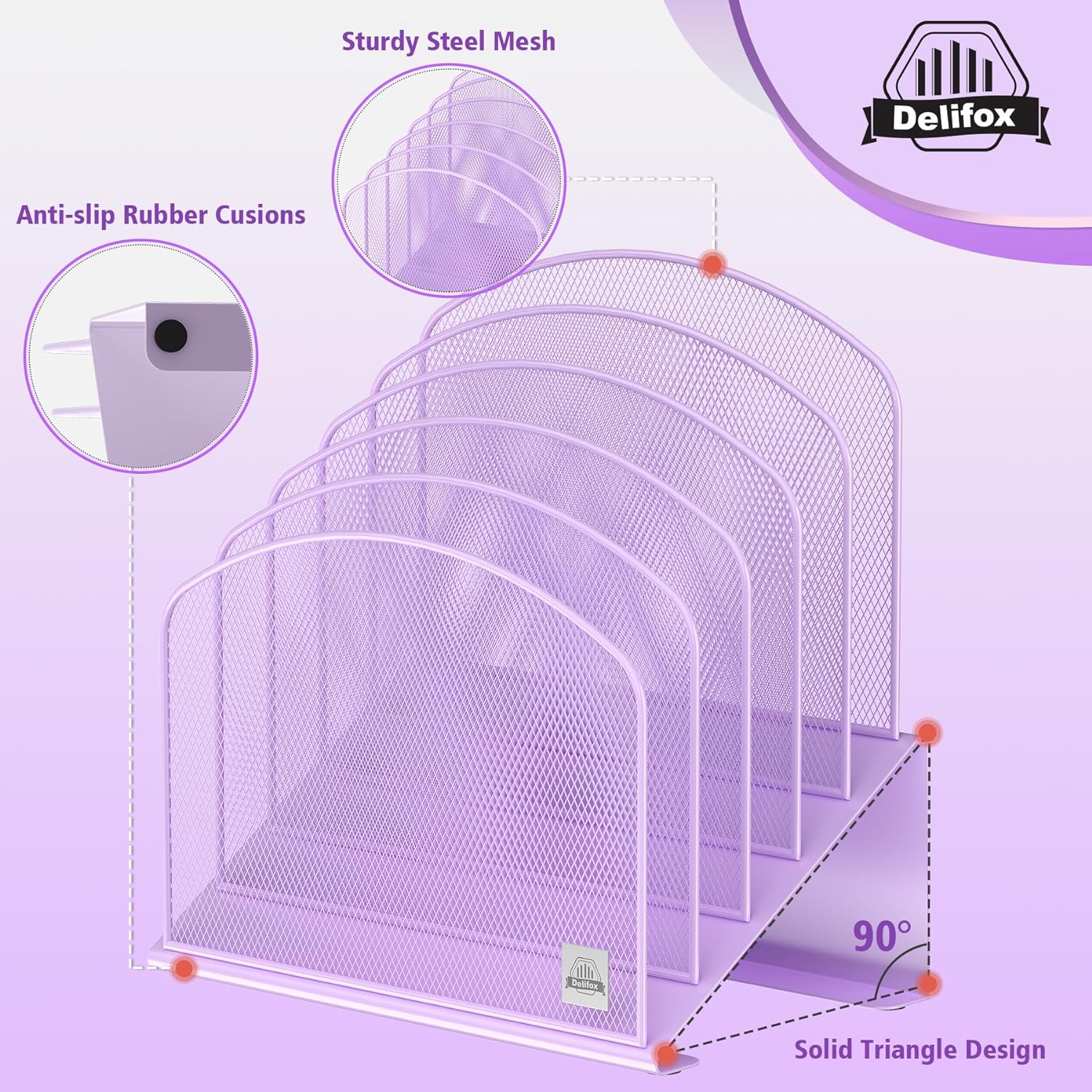 Inclined Desk File Organizer, 5-Section Vertical File Folder Holder Stand Metal Rack File Sorter for Office Classroom Desktop Organization (Purple, 1Pack)