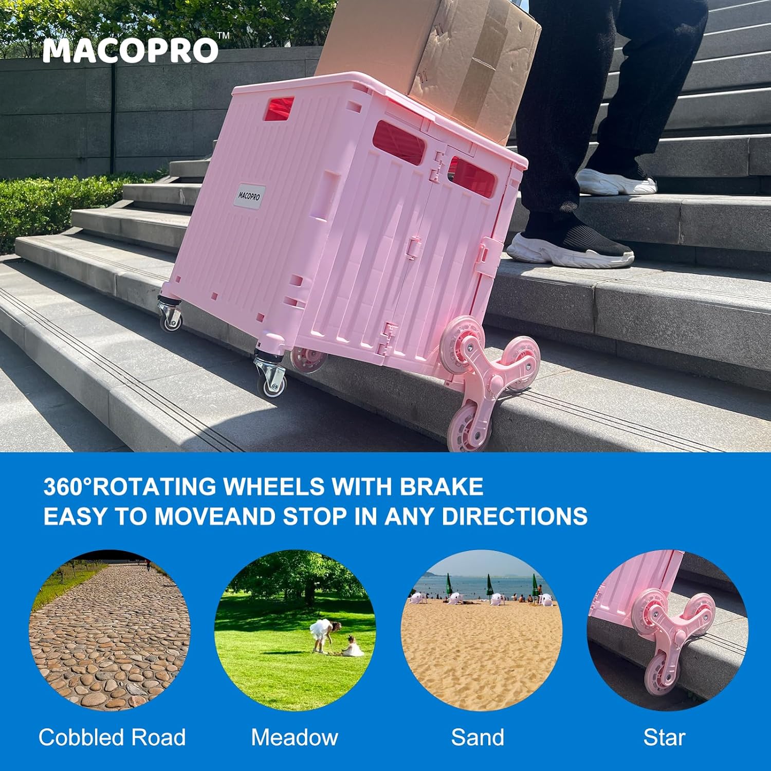 - 【Stair Climbing Cart】MACOPRO folding shopping cart is equipped with two stair climbing wheels and two detachable 360° rotating noiseless wheels. This stair climbing wheels features a unique 6-wheel design that effortlessly glides up and down stairs.