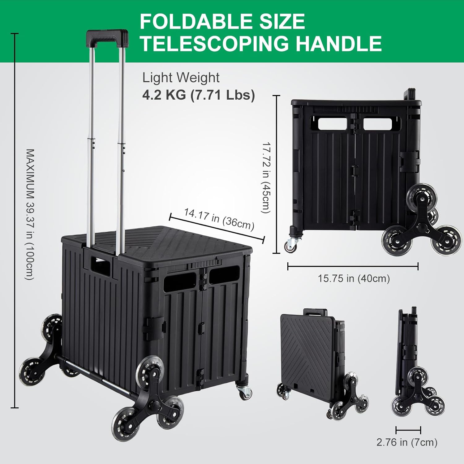 - Special Feature : Adjustable Handle, Collapsible, Compact, Heavy Duty, Stair climbing