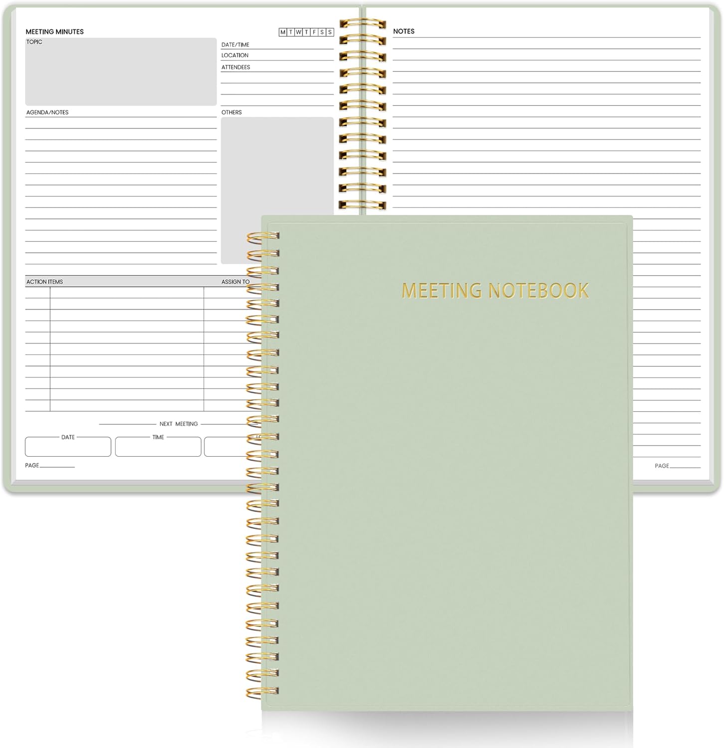 - Half Meeting Half Note: 1.MEETING PLANNING: Date, Location, Topic & Attendees 2.MEETING MINUTES: Agenda, Quick Notes & Other 3.NOTES AREA: Lined Page 4.ACTION ITEMS: Action Steps, Person, Due Date & Check Box 5.NEXT MEETING: Date, Time & Location 6.INDEX PAGE: Date, Title, Page Number, which will help create more effective meetings and good results.