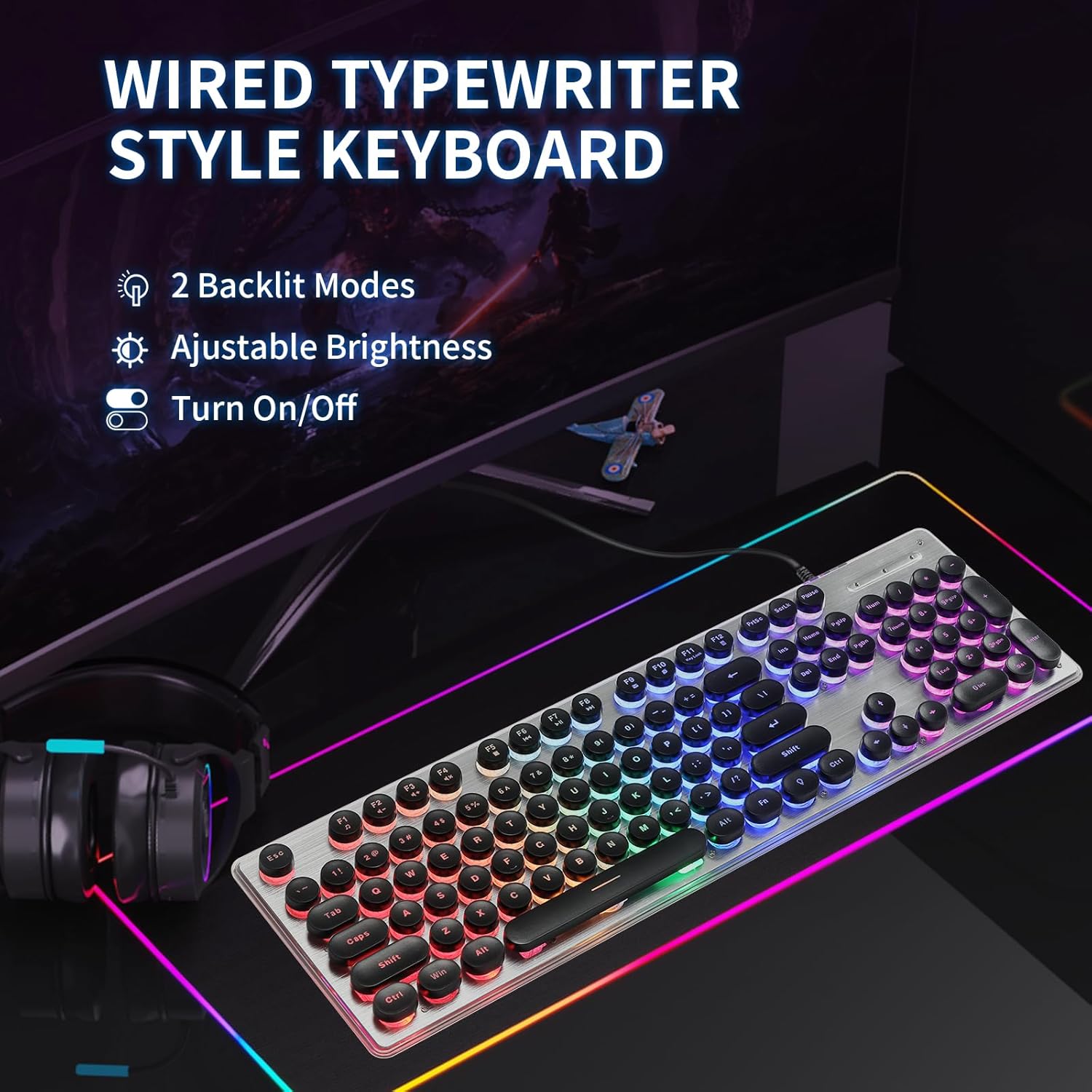 Typewriter Style Keyboard with Metal Panel, Rainbow LED Backlit, Round Keys, Anti-ghosting, Spill Resistant, Light Up USB Wired Retro 104 Keys for Office,Gaming, Black/Silver