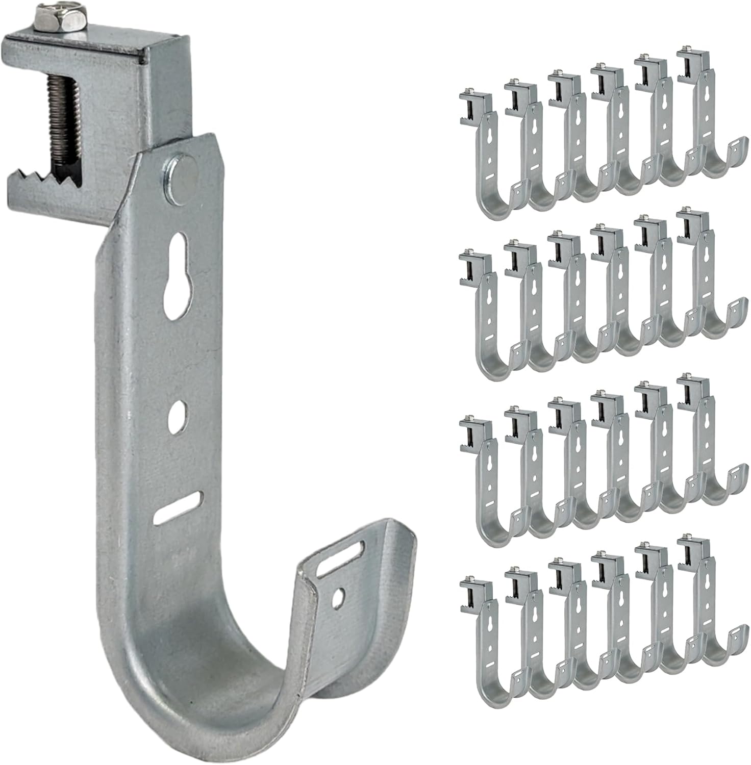 - SUPERIOR MATERIAL QUALITY: Constructed from galvanized steel, our Beam Clamp J-Hooks are built to last. They’re also built with a rust-resistant zinc finish, offering reliable support for cables and lightweight fixtures, and providing peace of mind in installations where cable management is crucial.