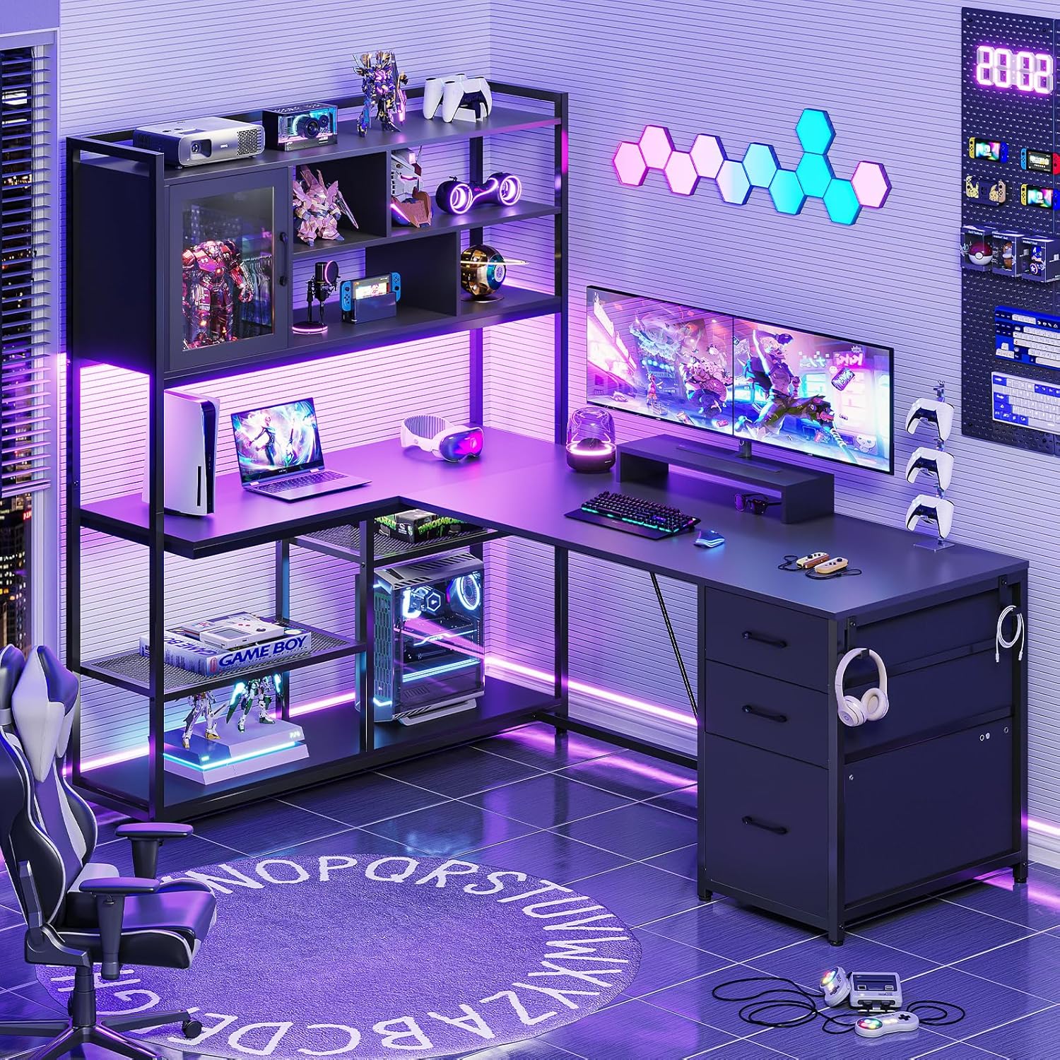 SEDETA L Shaped Computer Desk, 58'' Office Desk with 3 Drawers and Bookshelf, L Shaped Corner Desk with Storage Shelves and LED Light for Home Office, Gaming Desk, L Desk, Black