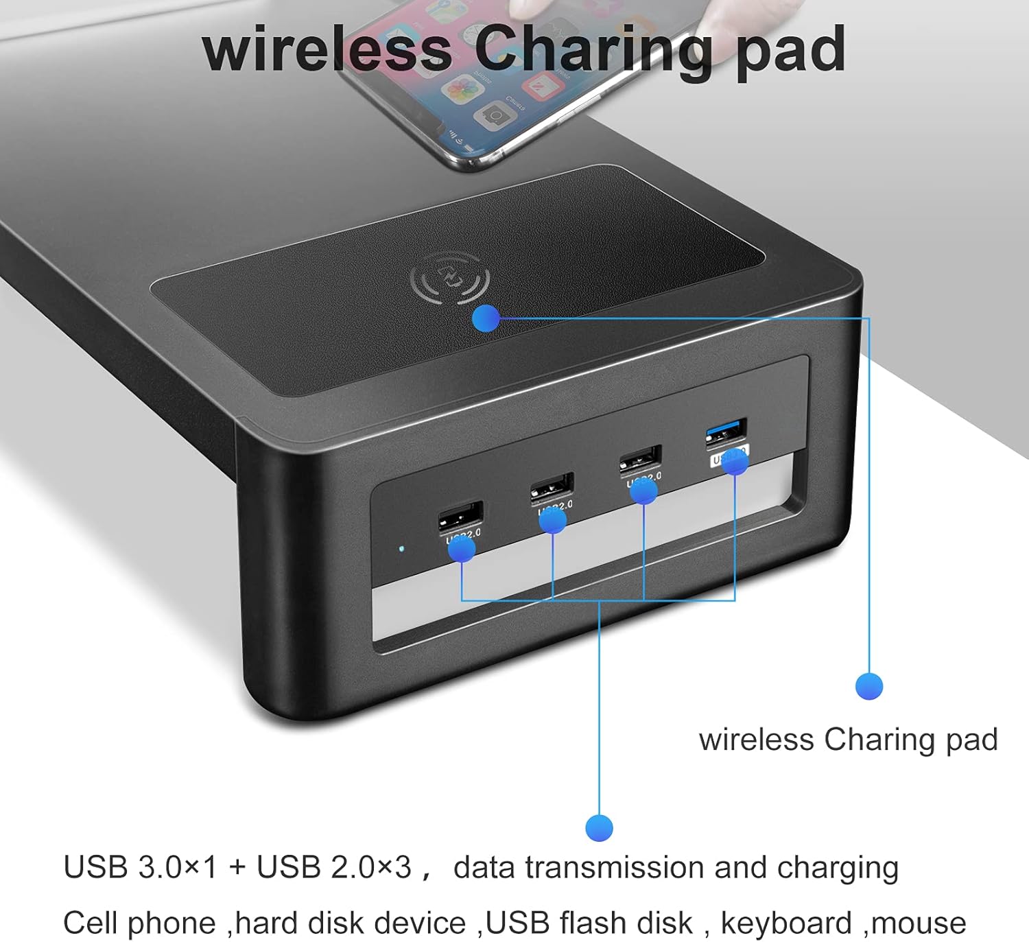 Dual Monitor Stand with Wireless Charging and 4 USB 3.0 Ports, Steel Monitor Stands for 2 Monitors, Metal Computer Stand Riser for Desk, Office, Laptop, PC up to 32 Inches (Black)