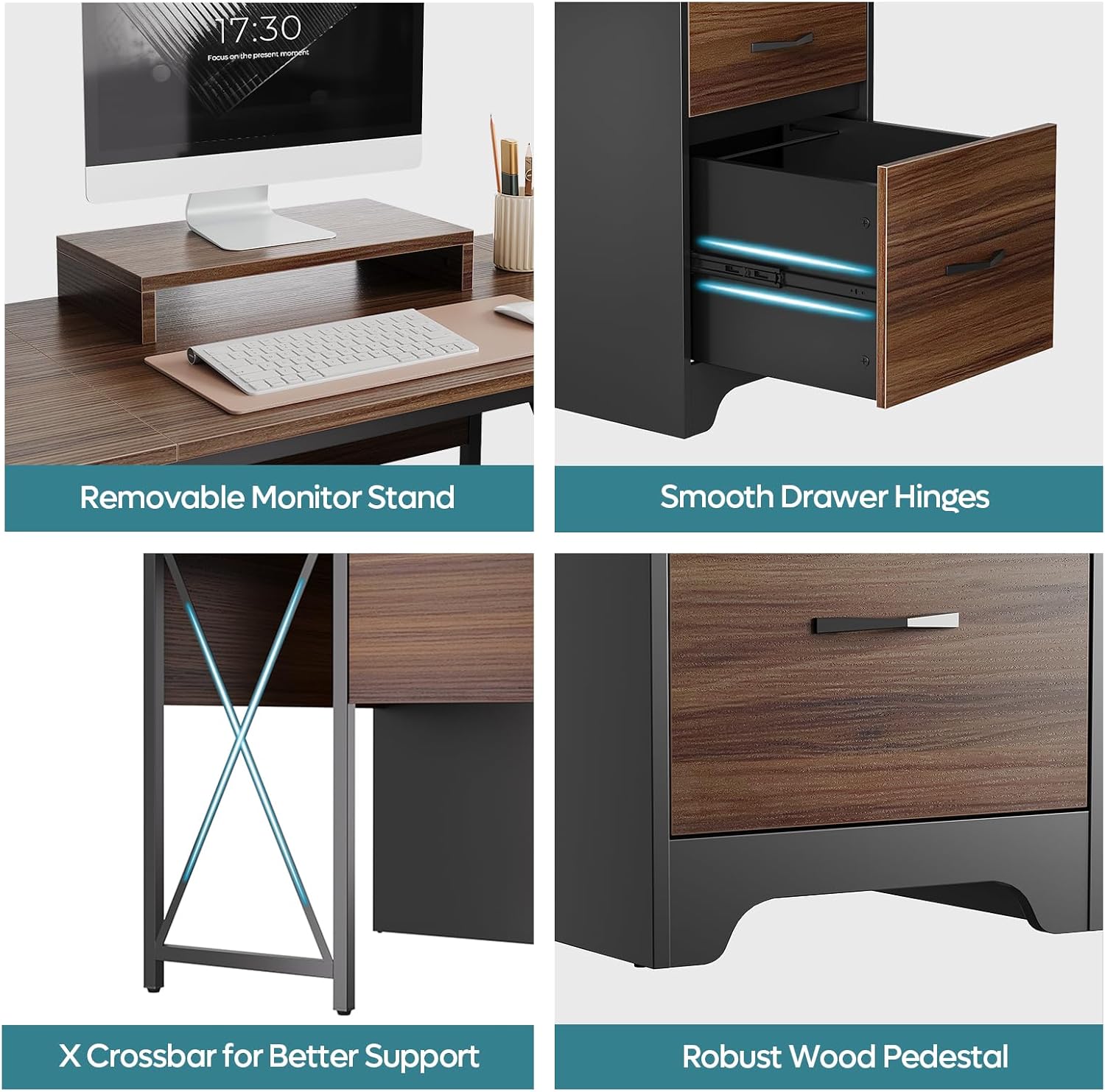 Bestier L Shaped Desk with 4 Drawers, 63" x 47" Executive Desk with Open Storage & Monitor Stand, Corner Desk with 2 File Drawers & Modesty Panel for Home Office, Cherry