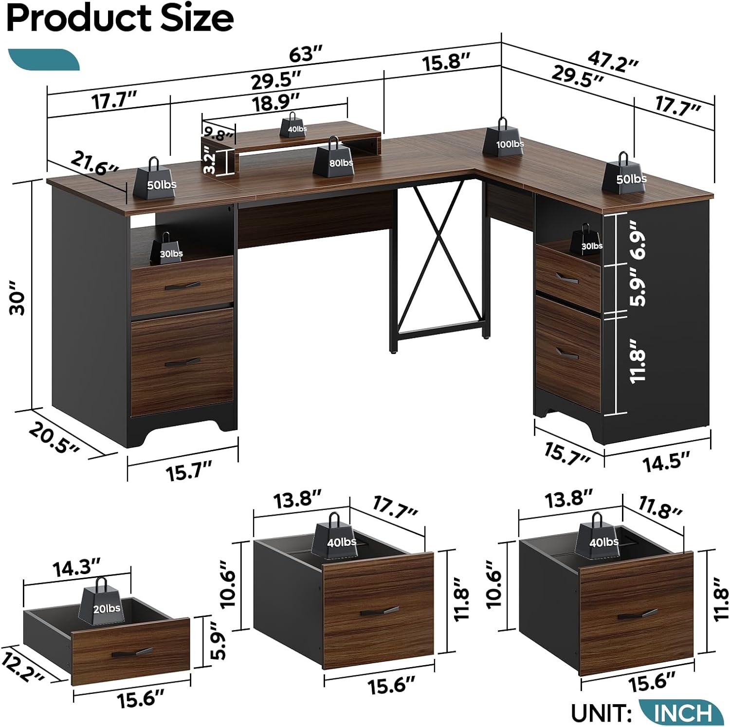 - Spacious L-Shaped Desk: The L desk design provides a spacious 63" x 47" desktop, offering ample space for multiple monitors, documents, and other office essentials, making it perfect for multitasking