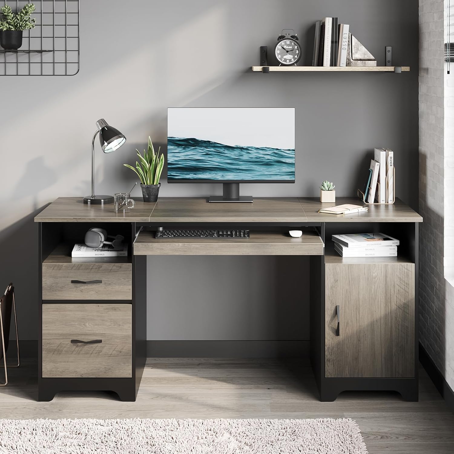 - Spacious Workspace: With a generous desktop size of 59" x 22", this work desk with storage provides plenty of room for your computer, documents, and other office essentials, facilitating efficient multitasking