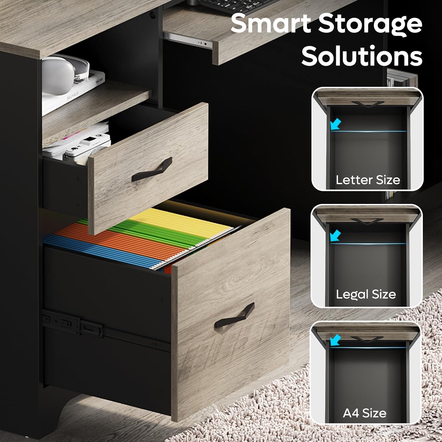 - Versatile Storage: This large desk features 2 open storage compartments, a storage drawer, a file drawer for letter/A4/legal-size hanging file folders, and a dust-free storage cabinet, offering a variety of storage options to keep your workspace organized and your essentials dust-free