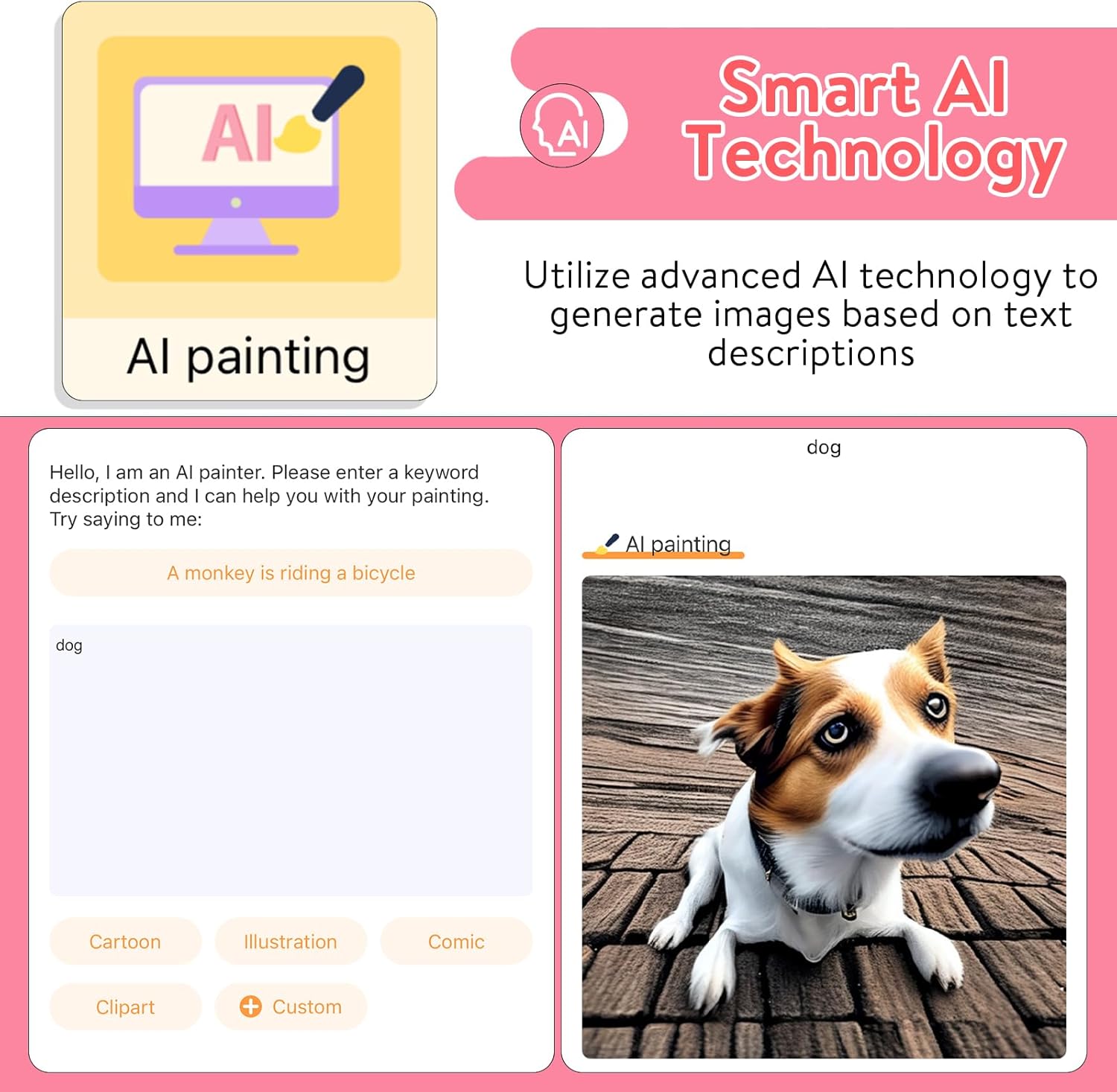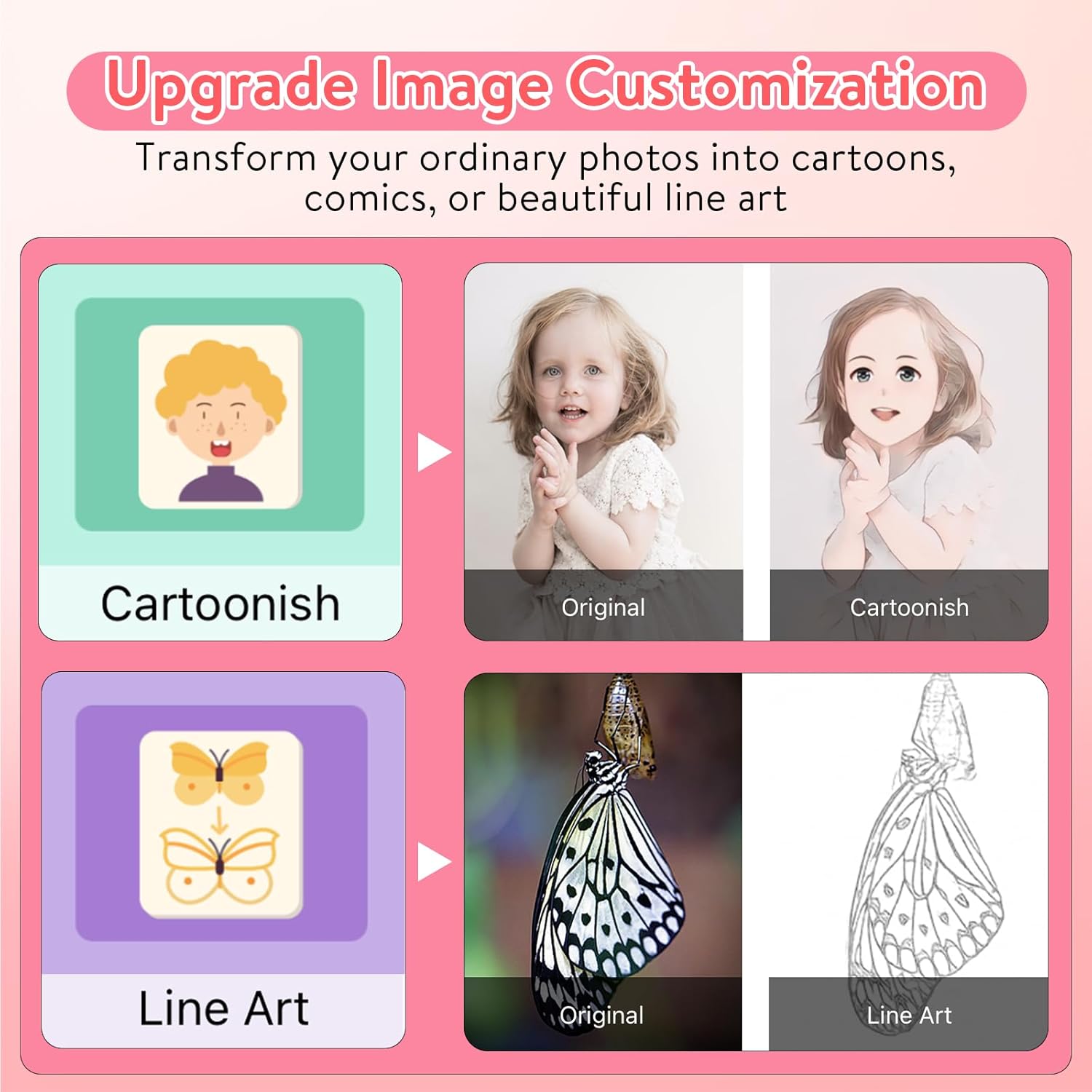 - AI Intelligent Printing: Newly upgraded AI function, AI intelligent generation of images, AI photo conversion into cartoons, line art, etc. Enter the text description of the desired image and generate the desired image for printing. You can also convert portrait photos into cartoons through AI intelligent conversion for more fun printing
