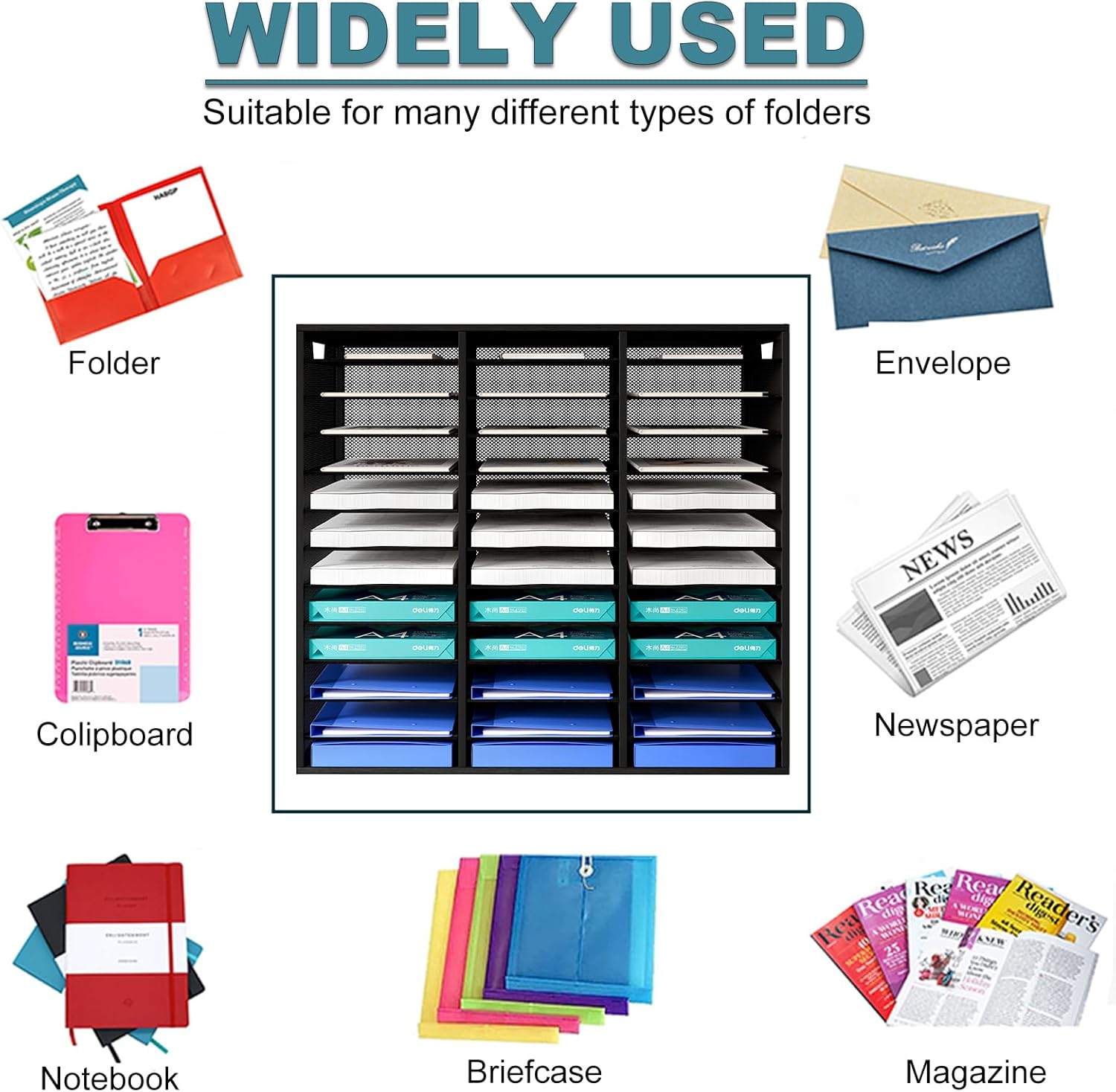 - ▶Amazing Storage Capacity and Space-saving. The literature organizer has 36 compartments, which can help you sort, store and organize literature, magazines, comic books, files, student assignments, binders, catalogs, diaries, papers and documents on your desk or counter quickly and easily and get you valuable workspace back