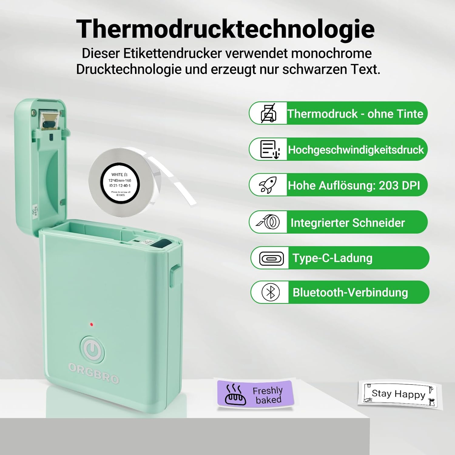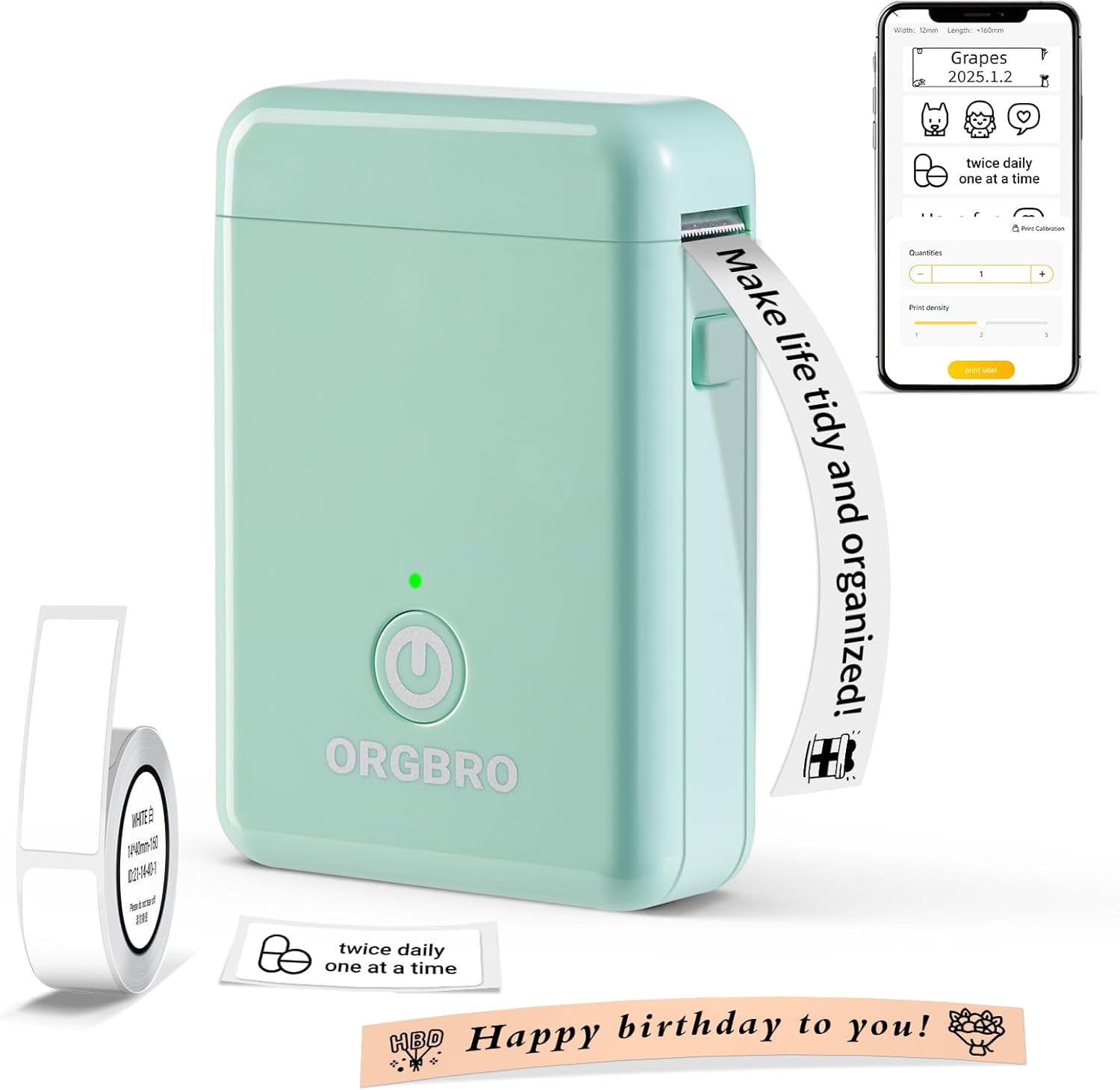 - Label Durability: ORGBRO label maker comes with a roll of 12 x 40 mm white pre-cut labels; ORGBRO labels waterproof, oil-resistant, and abrasion-resistant. No residue remains after removal; Supports continuous label paper (15 mm width) and fixed-length labels (12 x 40 mm); We recommend using ORGBRO thermal label paper for optimal print quality