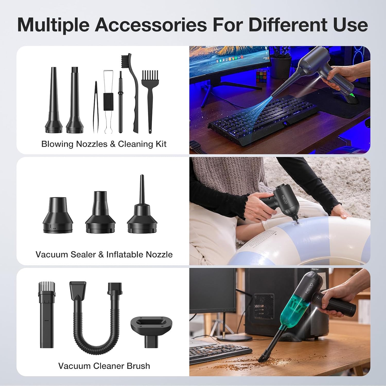 - Brushless Motor & Strong Blowing Power: This 4-in-1 Compressed Air Duster and Mini Vacuum Cleaner is equipped with a powerful 120W brushless motor, strong power for more thorough cleaning. The noise is 20% lower than other vacuum cleaners on the market. Whether it is dust on the computer keyboard, between car seats or ventilation ducts, it can be easily and thoroughly removed