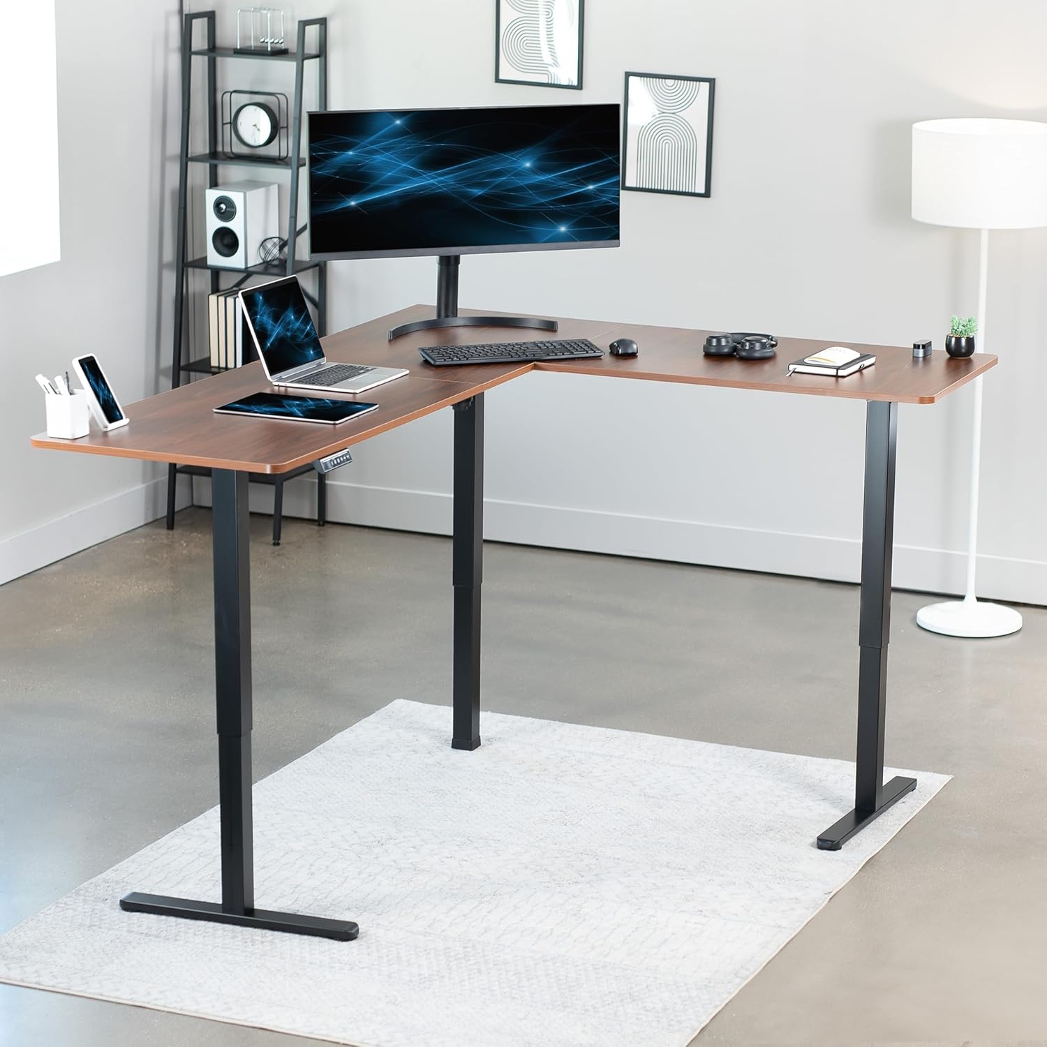 - L-Shape with 3-Part Top: Includes a spacious main desk and return desk, accommodating a variety of monitor and laptop setups along with important work materials, supplies, and decor. When fully assembled, the outside surface measures 74.8” x 63”.