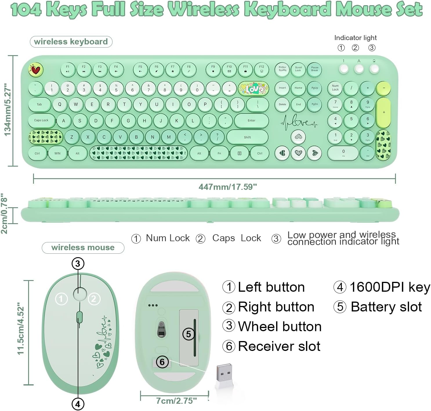 Wireless Keyboard Mouse Set,MOFII 104 Round Keys Lovely Retro Cute Colorful Computer Typewriter Keyboard and Mouse for PC/Mac/Laptop/Tablet/Computer/Windows Green