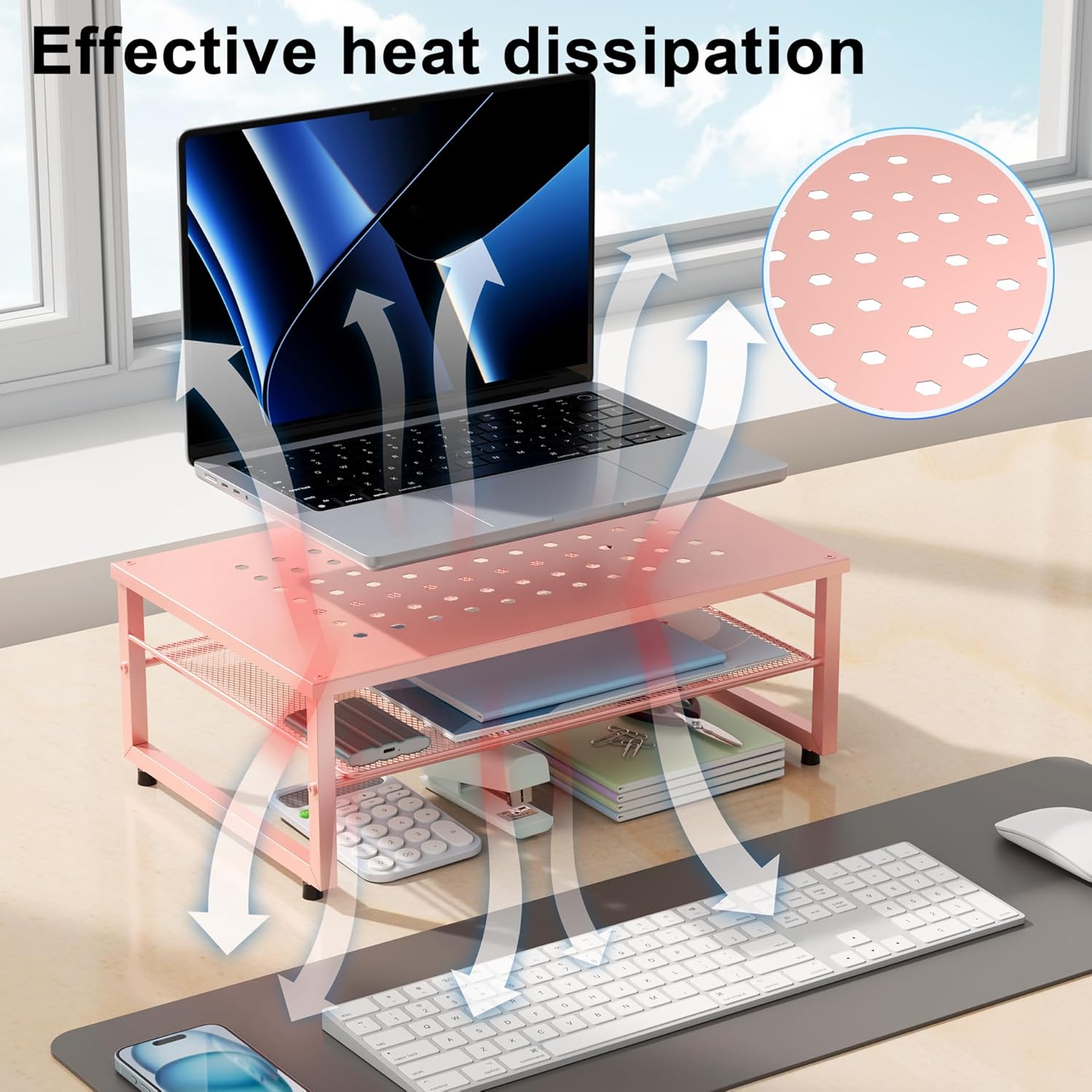 - 【Practical and Stylish】 The laptop stand has a simple yet sophisticated dual-layer design, providing ample space to store various office supplies, keeping your desk tidy. This allows you to work more efficiently in a comfortable and organized environment.