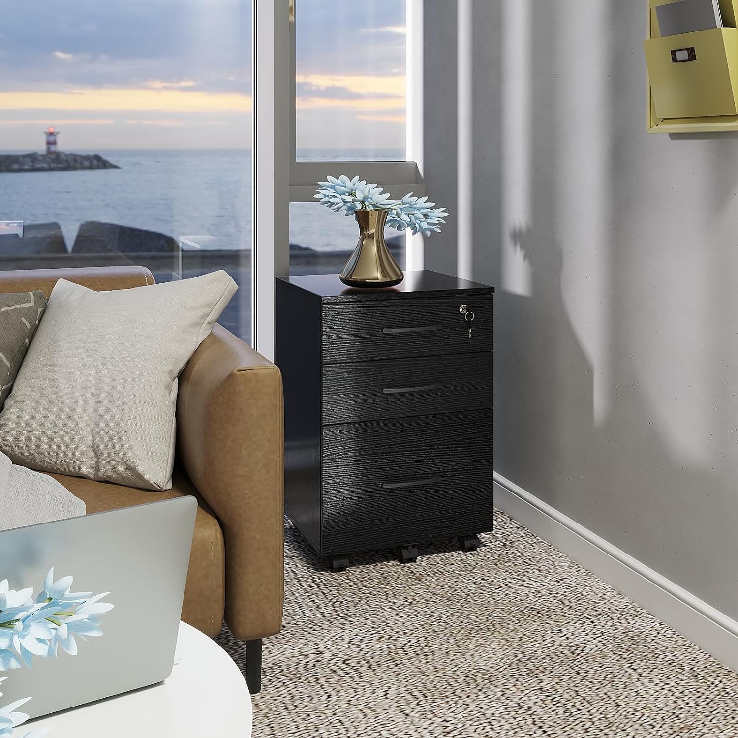 File Cabinet with Lock,3 Drawer Wood Rolling Filing Cabinets Under Desk for Home Office, Office Storage Cabinet fits Letter/A4 Size,Mobile Filing Cabinet Printer Stand,Black