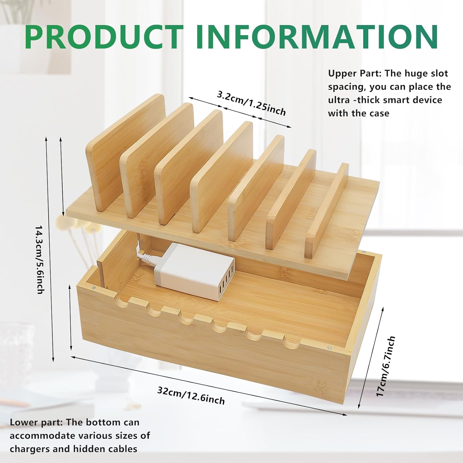 Bamboo Charging Station for Multiple Devices (Includes 5 Port USB Charger, 6 x Charge Cables), Upgrade Desk Docking Stations Organizer for iPhone Devices, Tablets, Laptop Holder Stand