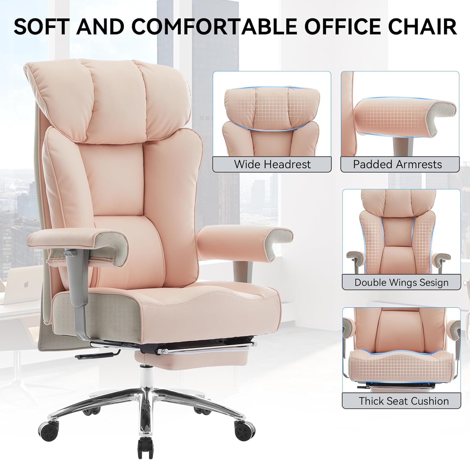 - ADJUSTABLE HOME OFFICE CHAIR FOR A BETTER USER EXPERIENCE The executive office chair features adjustable options for office chair height, office chair backrest angle, and office chair armrests, allowing for a personalized comfort experience tailored to individual preferences. The girls office chair also includes a reclining function and a retractable footrest, both of which enhance the user’s relaxation experience in the office chairs.