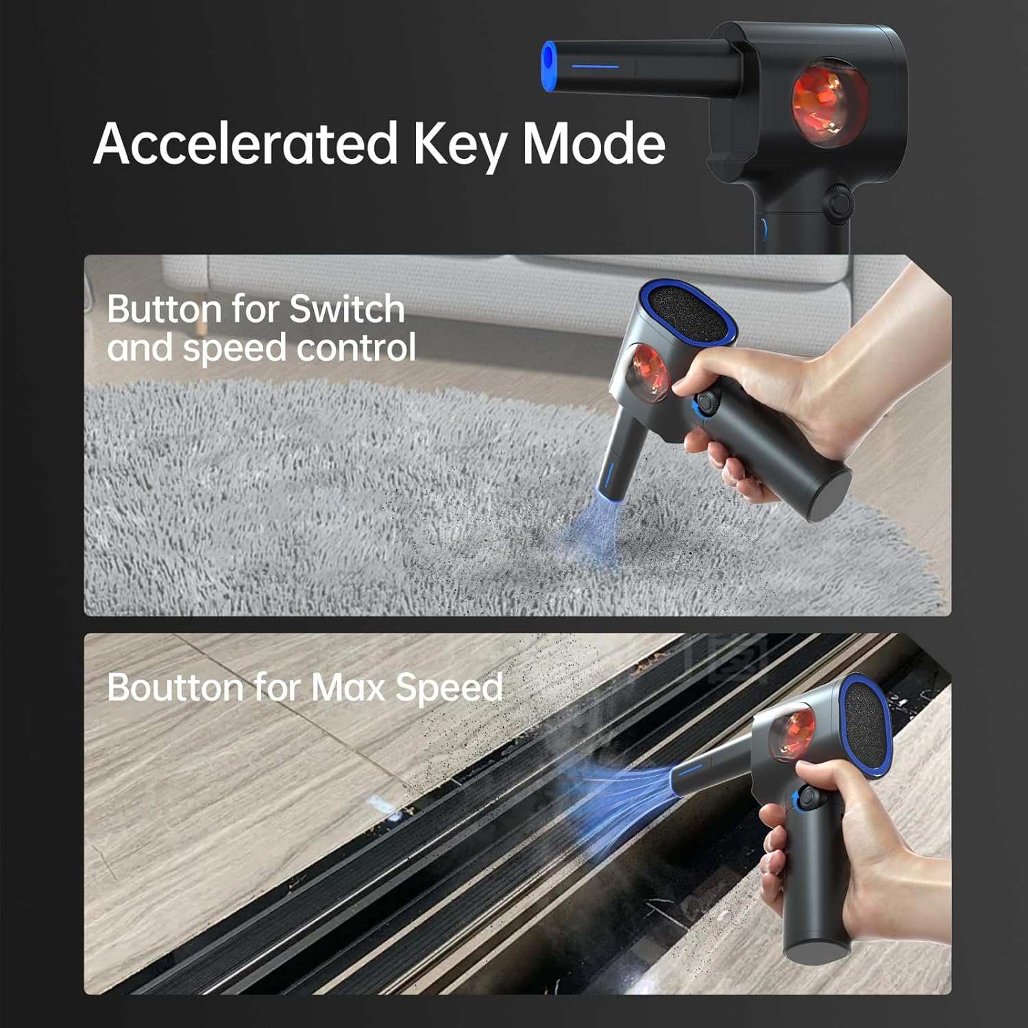 - 【Acceleration Mode】 The Rechargeable Air Duster is equipped with an acceleration button. After starting the Air Duster by turning the knob, when you want to continue to increase the wind force, just press the acceleration button to increase the wind force on the basis of the original wind force. Stop pressing the acceleration button to return to the original wind force. Combined with a brushless DC motor, it achieves higher speed and stronger wind force while maintaining stable performance.