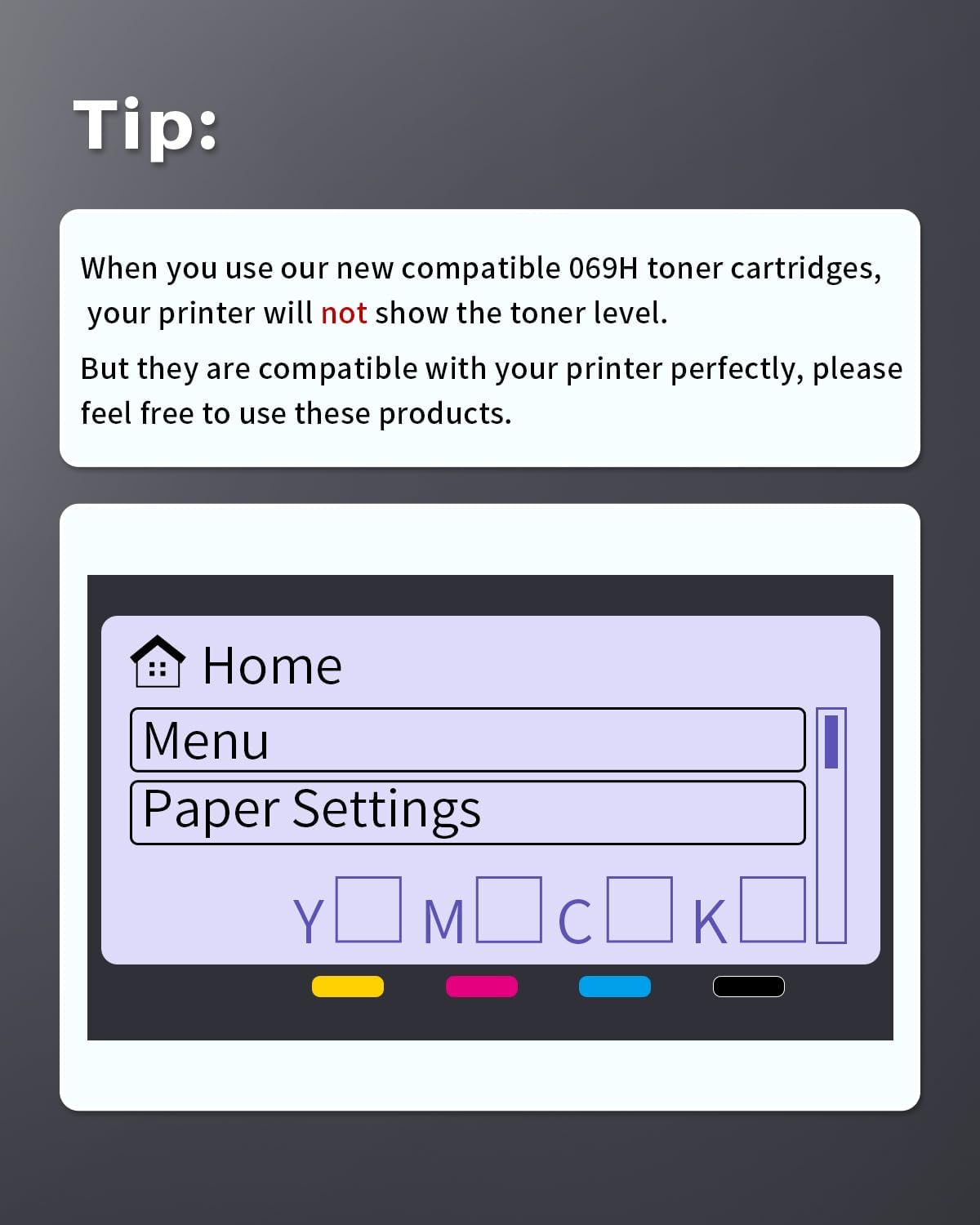 - 2. Package Includes: compatible 069H toner cartridges 4 pack — 1 × 069H black, 1 × 069H cyan, 1 × 069H magenta, 1 × 069H yellow