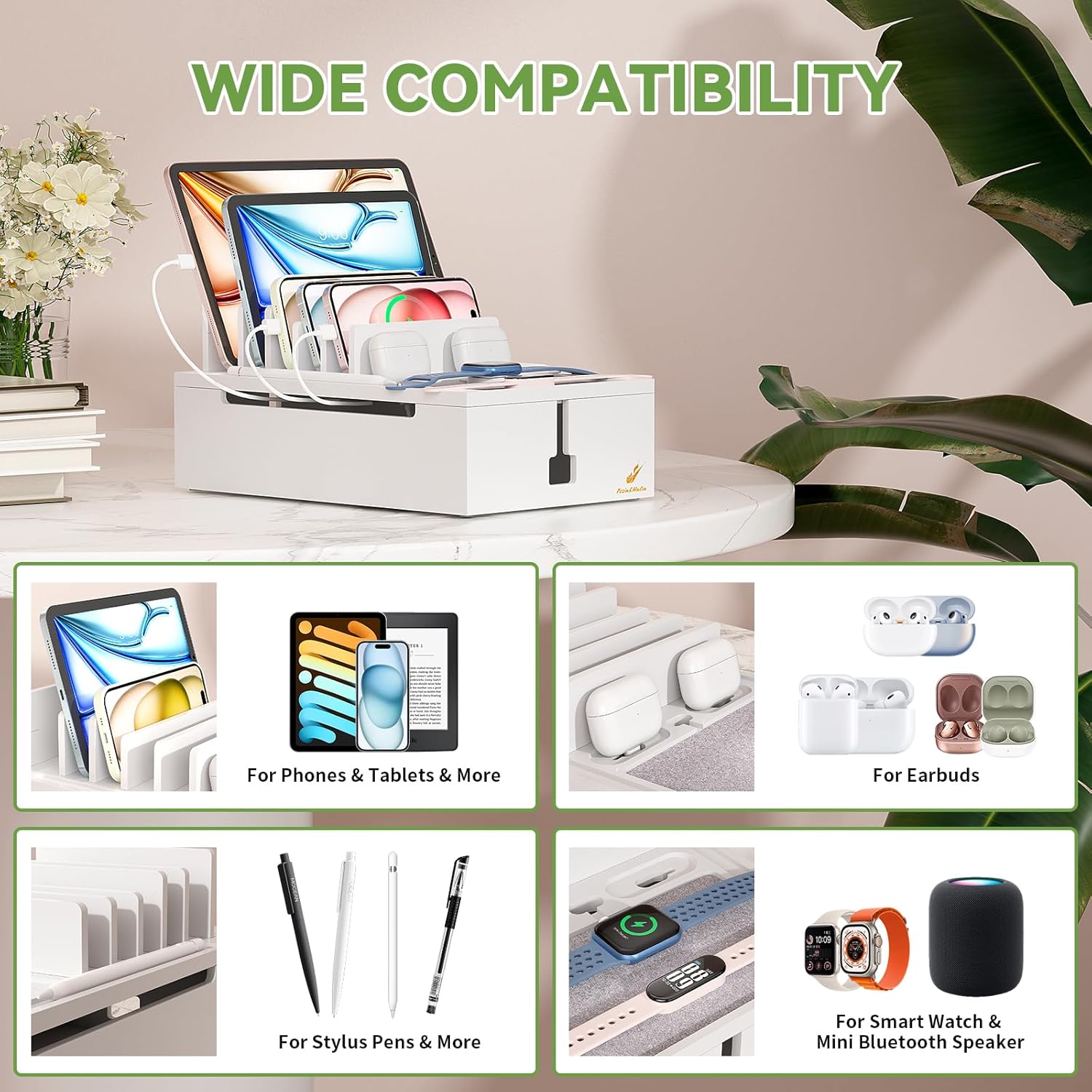 - Creative Design: Our Charging Station designed with a wide flat tray with felt pad not only aesthetic, but also can prevent your items from being scratched. Spacious 6 baffles can hold your phones, tablets or game consoles no matter how thick case on. 4 special grooves can organize your earbuds and stylus pens (Each part is designed with data cable holes for easy charging and hold cables in place)