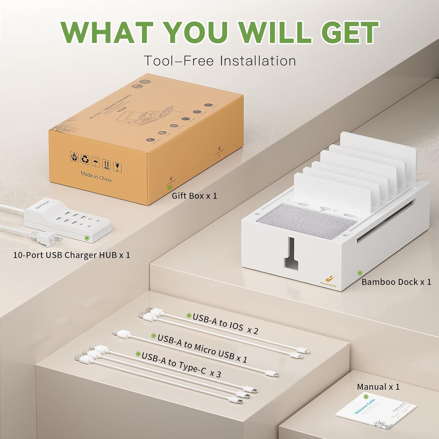 - What You Can Get: 1 x Pezin & Hulin Bamboo Charging Station, 1 x 10-Port USB Charger HUB & Cord, 6 x Short USB Cables (3pc Type-C, 2pc for lPhone & lPad, 1pc Android) for your daily use, 1 x user manual