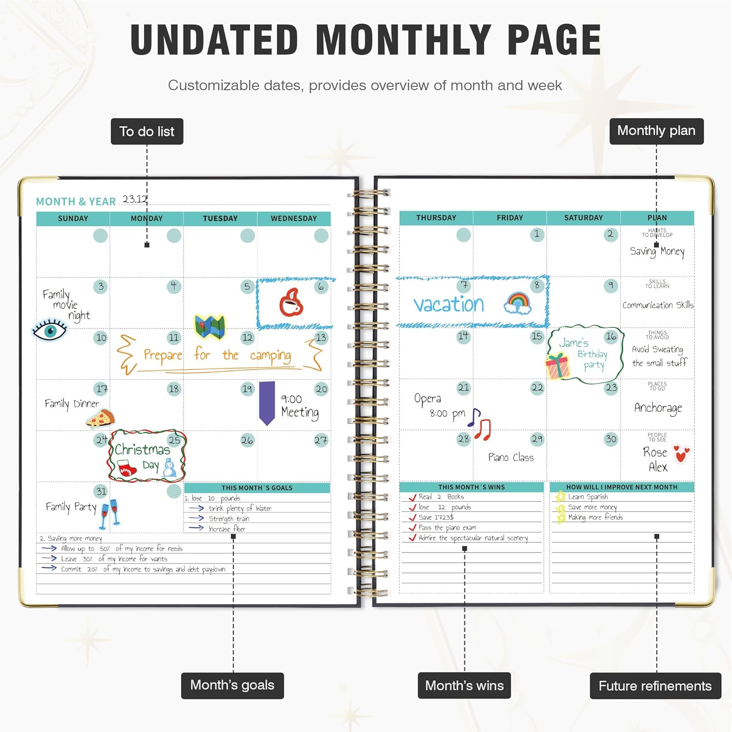 - Undated Clear Layout: With 12 blank months and 53 weeks, a 7 AM to 8 PM daily schedule section, and additional sections for contacts, passwords, awareness and self-discovery, daily rituals, goals, and notes, this life planner offers the freedom to plan your schedules at any time.