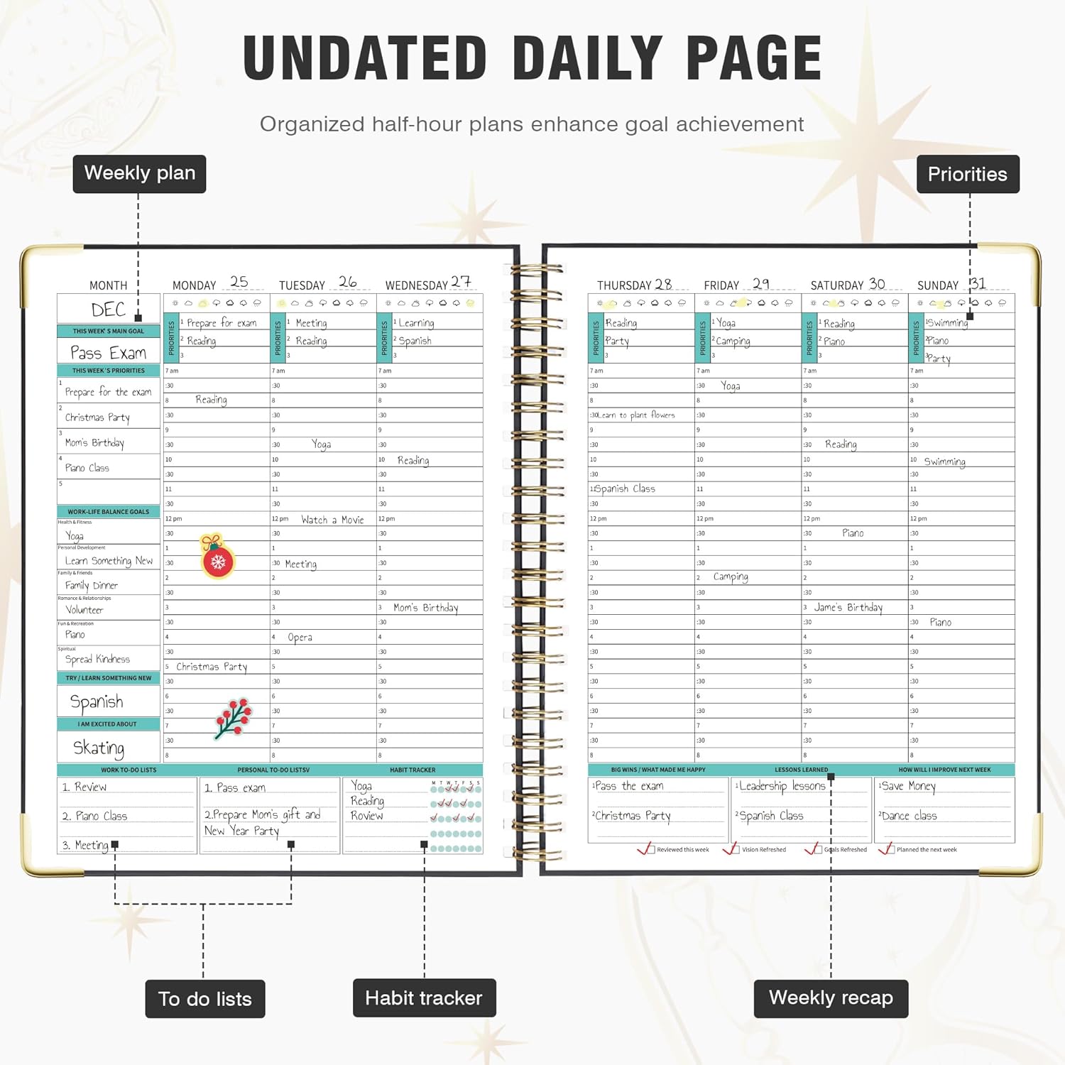 - Boost Your Productivity: Additional accessories included: instructions, bookmarks, stickers, and labels. Whether for work, study, or personal use, this planner is the perfect tool for achieving your daily priorities and taking control of your schedule.