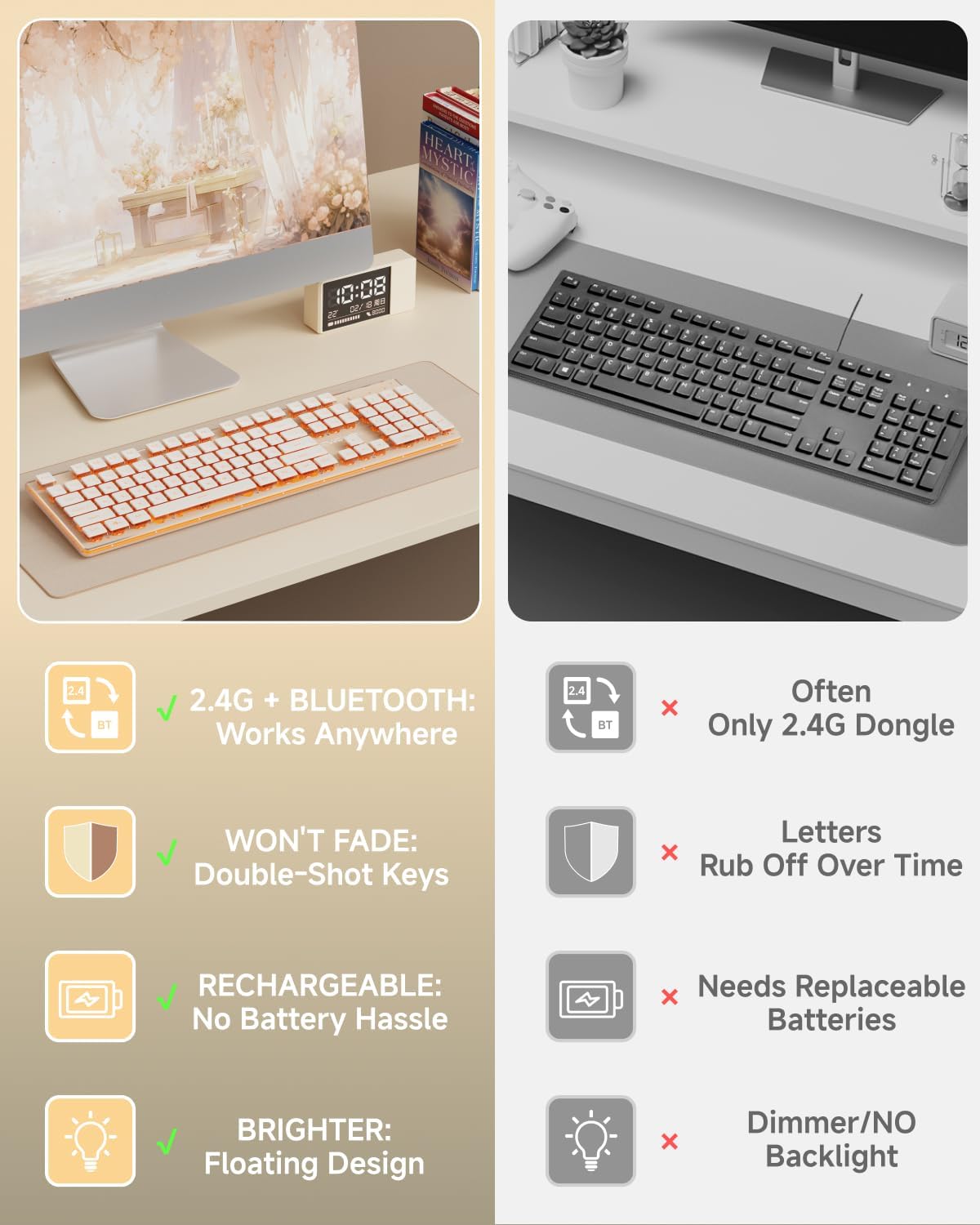 - Upgraded Water Drop Keycaps & Less Noise: Full size keyboard wireless uses upgraded suspended water drop keycaps with great light transmittance. The surface of the keycaps concave and convex design, which fits your fingertips well, typing or gaming more comfortable and easier. Also quieter, reducing typing noise by 95%. With wireless silent mouse, you no longer worry about noise disturbances in the library, cafe, office or dormitory.