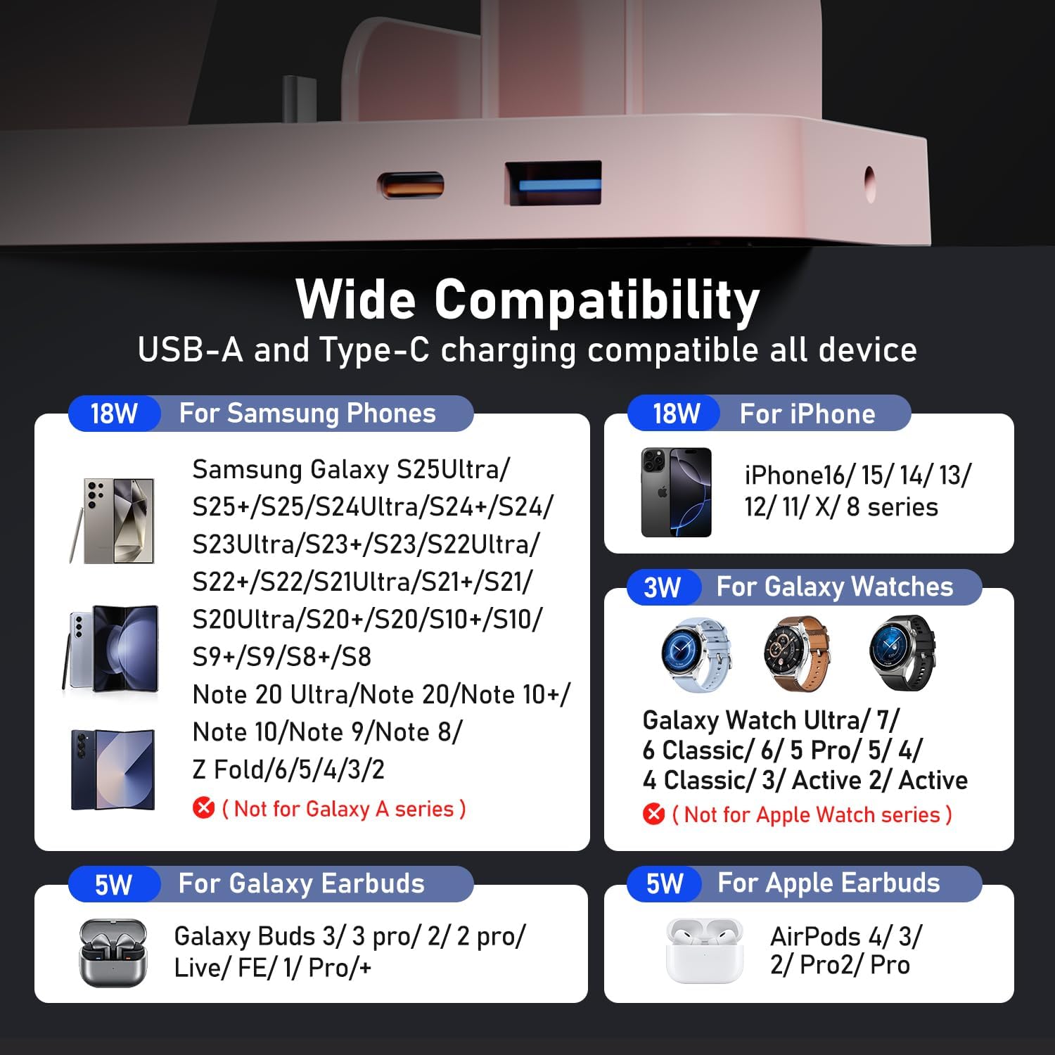 - 【Widly Compatibility】Our charging station works for almost all samsung android and iphone that support wireless charging (NOT FOR Galaxy A and Flip Series). Such as S25 Ultra/S25/S24 Ulta/S23/S22/S21/S20/Note20/10/9/8/7, Z Fold 7/6/5/4/3/2, iPhone 16/16e/16 Plus/16 Pro/16 Pro Max/iPhone 15/15 Plus/15 Pro/15 Pro Max/iPhone 14/14 Pro Max/14 Plus/14 Pro/iPhone 13/13 Pro/13 Pro Max/13 Mini/12/12 Pro/12 Pro Max/12 Mini/11/11 Pro/11 Pro Max/SE/XS MAX/X/XR/8/8 Plus