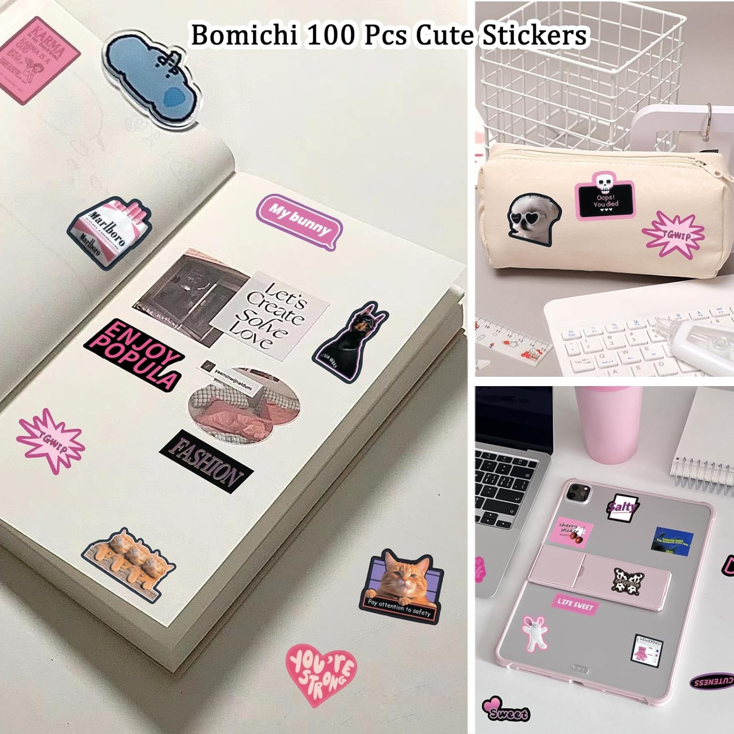 100 Pcs Cute Cartoon Pink Words Style Stickers for Scrapbooks,Cute Vinyl Stickers for Water Bottles Skateboard Notebooks Phone Kindle,Laptop Stickers for Kids Teens Adults Girls