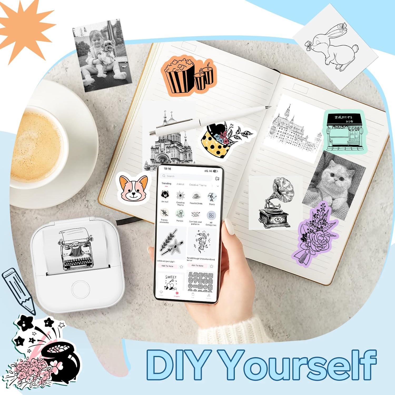 - Bluetooth sticker printer can connect to phones and tablets: The Y02C mini printer for phone is compatible with iOS and Android system devices. After downloading the APP, it connects with one-click via Bluetooth. The APP provides a variety of patterns, fonts, and templates in different themes to bring fun to your printing