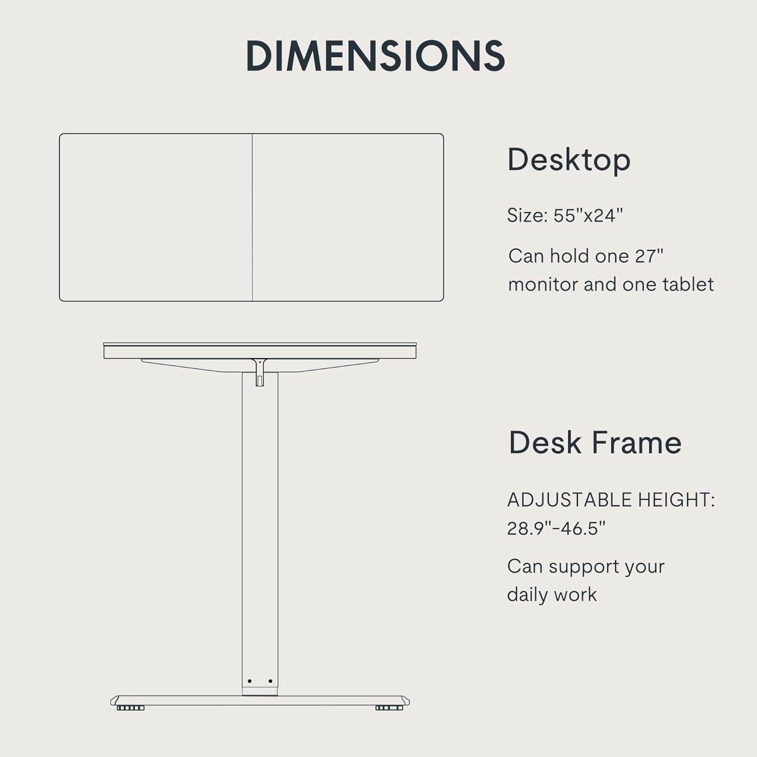 - SPACIOUS WORK AREA: The 55" x 24" desktop offers plenty of room for multiple monitors, laptops, and office essentials, keeping everything within reach and at eye level to reduce neck strain.