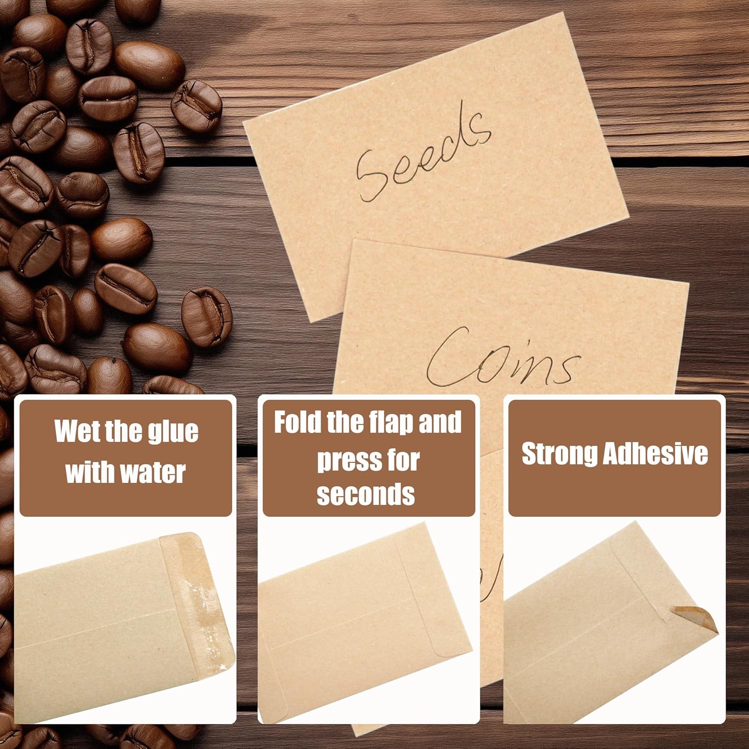 - Gummed Flap: Mini Coin Envelopes are water-glued seals, so when you put small items in envelopes, just wet the seal slightly with water, fold and keep the flap glued 2-3 minutes to seal. Strong-adhesive, easy and security