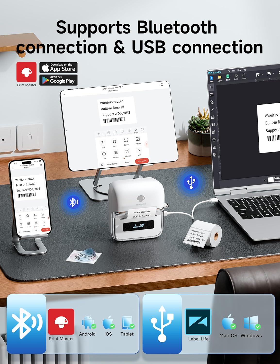 - Highly Compatible: Phomemo M250 mini sticker maker is compatible with multiple systems including Android, iOS, iPad & macOS, and Windows 7 or above. Connect your smartphone or iPad via Bluetooth using the "Print Master" app. For computer connection, simply download the driver and "Labelife" app, then connect using USB (refer to the software installation tutorial on the page for detailed instructions)