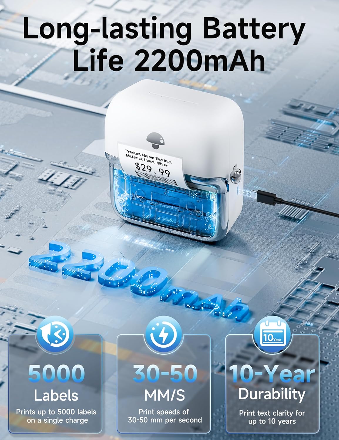 - 2025 Upgraded Version - Phomemo M250 Label Maker: With an extended battery life of 2200mAh, the Phomemo M250 portable label printer can print up to 5000 labels on a single charge. Enjoy a printing speed of 30-50mm per second. It features an automatic sleep mode that conserves energy by automatically shutting down after 5 minutes of inactivity, preventing unnecessary power waste