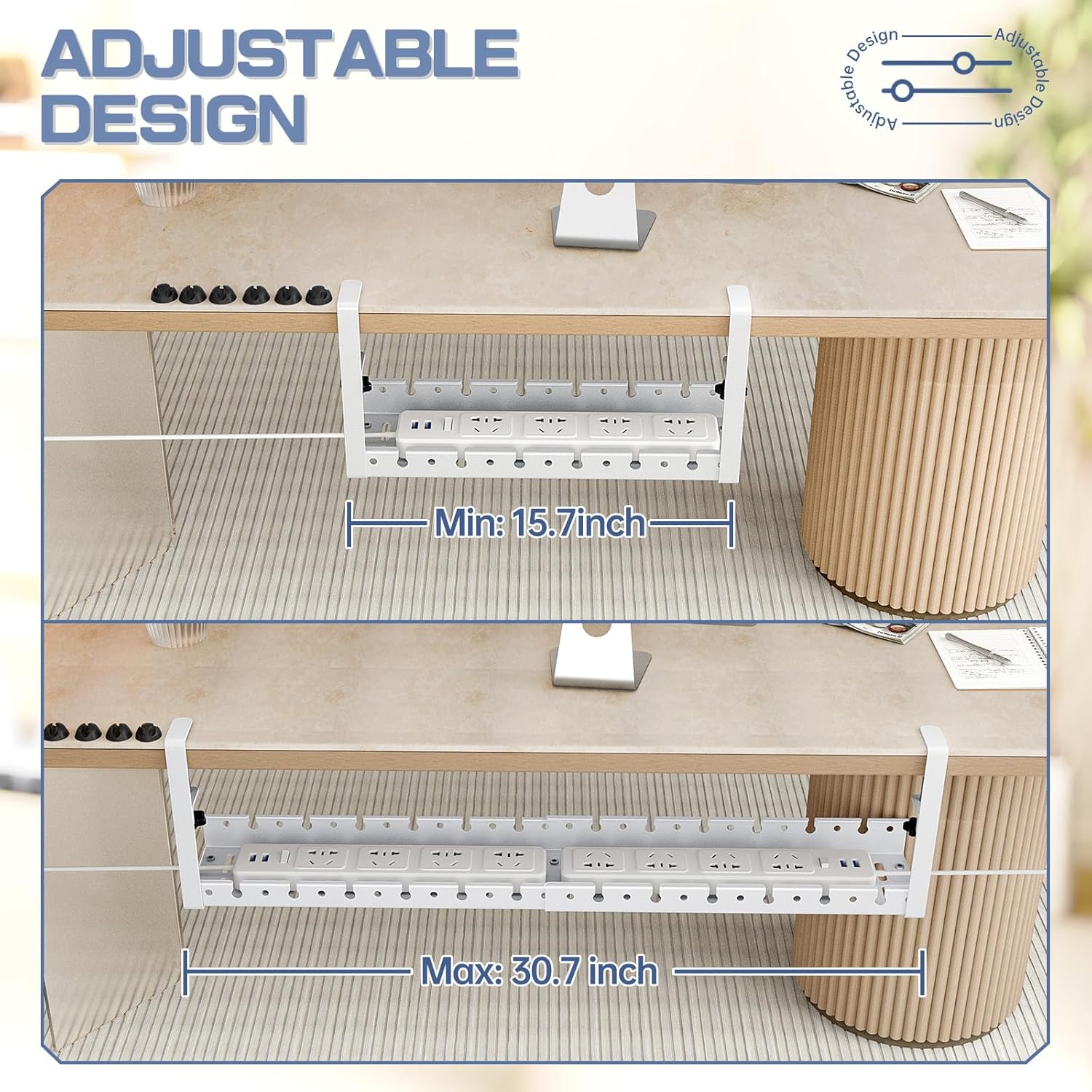- 【Space-saving Design】: Keep your desktop clutter-free with this adjustable, no-drill, easy-to-install and remove under desk cable management tray that holds multiple power strips and chargers. The C-clamps with adhesive anti-friction pads hold it in place without damaging the desk.
