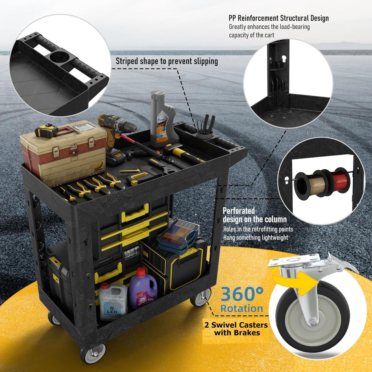 Service Utility Plastic Tool Cart, 34 x 17-Inch Rolling With Deep 2-Shelf, Heavy Duty Wheels, 550 lbs Capacity Organizer for Garage, Warehouse, Workshop