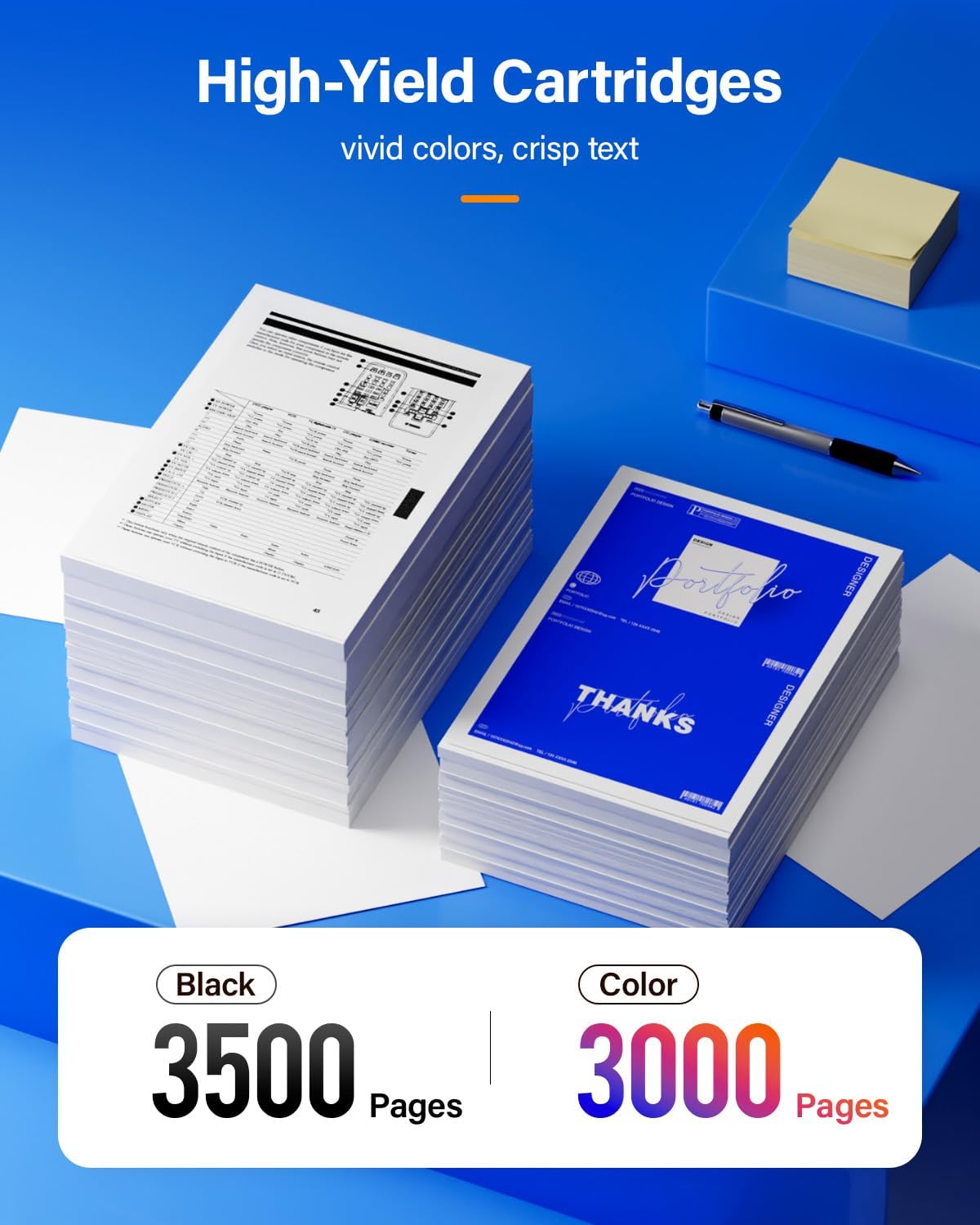 - 【Page Yield】Up to Black is 3,500 pages per black cartridge and Color is 3,000 Pages per color cartridge (Letter/A4, at 5% Coverage).