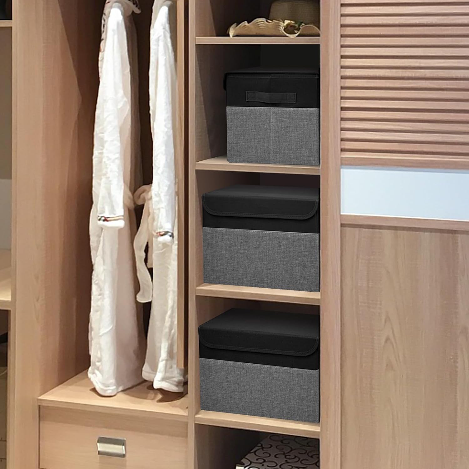 Large 17" 42 Quarts Collapsible Stackable Storage Bins with Lids [3-Pack] Foldable Fabric Linen Storage Boxes Cube, Closet Organizer Baskets with Label for Home (16.7 x 12 x 12", Black & Gray)