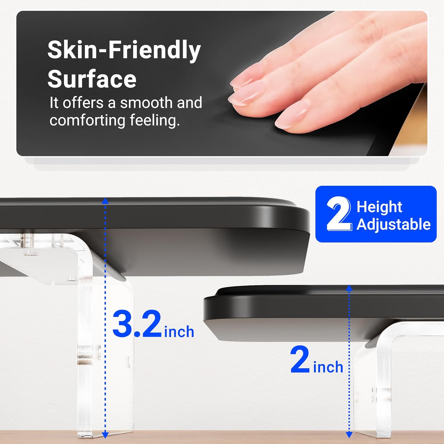 - 【Flexible Height Adjustment】The acrylic legs offer two height adjustment options: 2.75 inches or 1.57 inches. Choose the height that best suits your needs to reduce neck and back strain, optimizing your work or gaming experience.