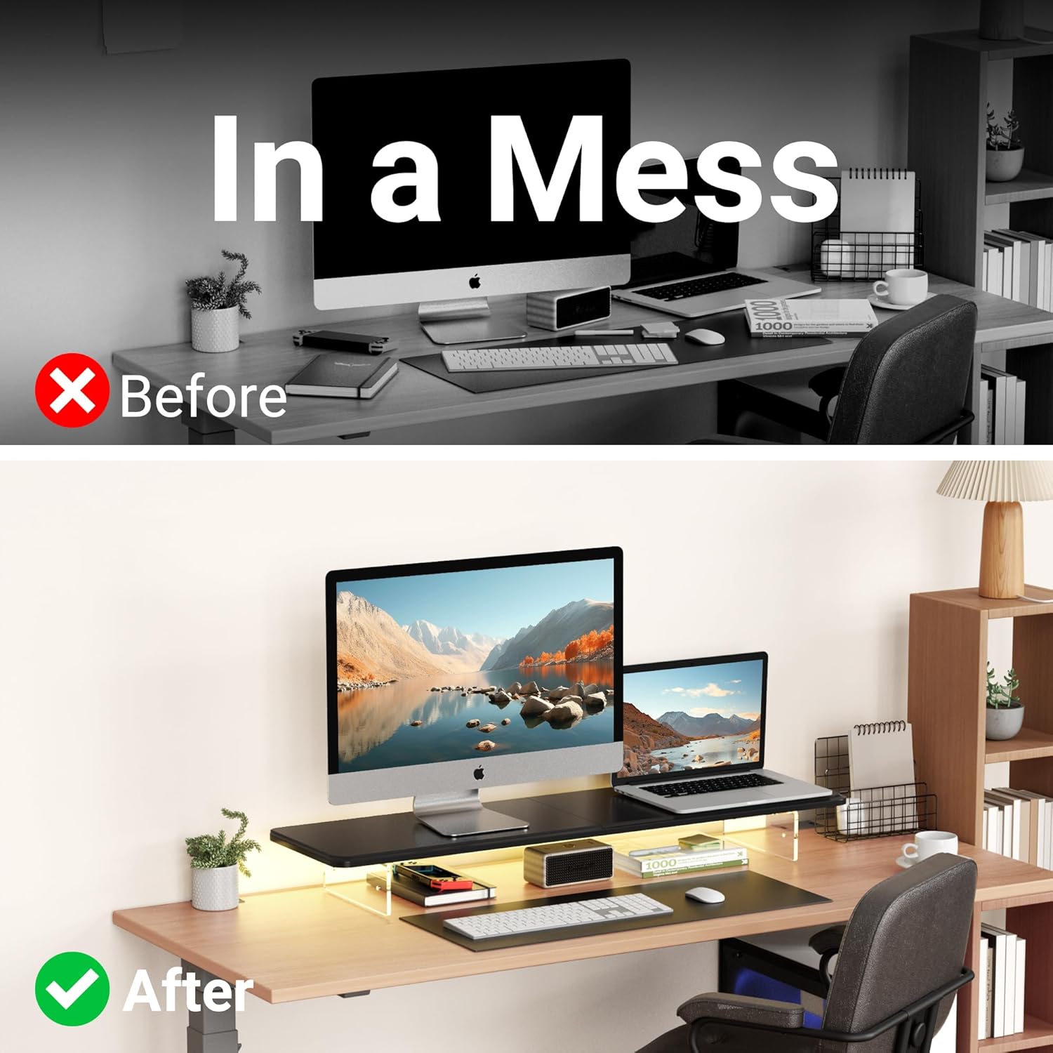 - 【Colorful Lighting with 24 Color Options】Our monitor stand features a 1-meter LED light strip that supports 24 colors and 4 lighting effects. Easily adjust the color and mode to create the perfect work or entertainment ambiance.