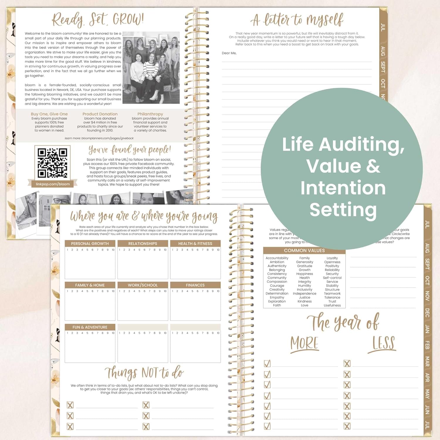 - BONUS ELEMENTS: Packed with life coaching worksheets and inspirational features to help you set and achieve all of your goals for the year: personal mission statement prompt and yearly goal setting page, weekly scheduling template, values page, habit tracking, vision board, monthly spending log, 13 notes pages, inspirational quotes, monthly challenges, and more!