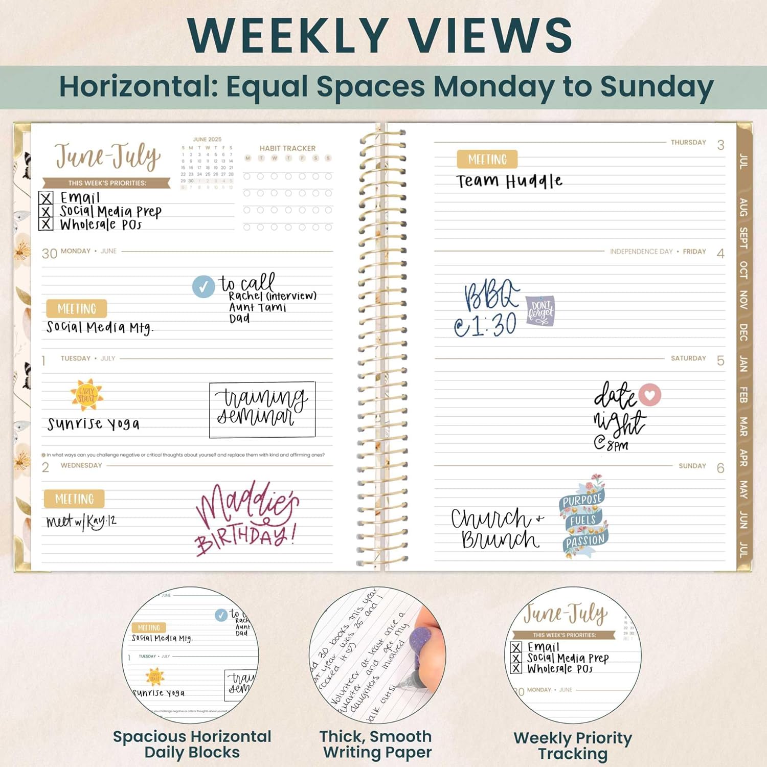 - 8.5” x 11” WITH HORIZONTAL WEEKLY LAYOUT & MONTHLY VIEWS: 2 page monthly overview spreads and spacious weekly views run Academic Year, July 2025 through July 2026. Weekly views are horizontal and include priority & habit tracking.
