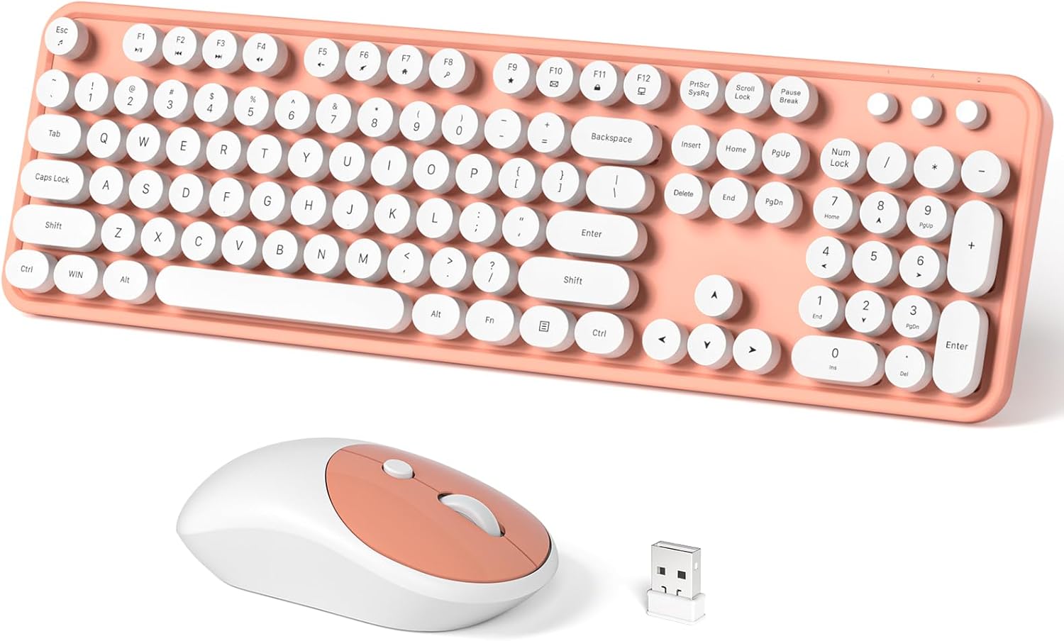 Wireless Keyboard and Mouse Combo, MOWUX Full Size Typewriter Retro Round Computer Keyboard, Mouse Wireless, Plug and Play, for Laptop, PC, Computer- Orange