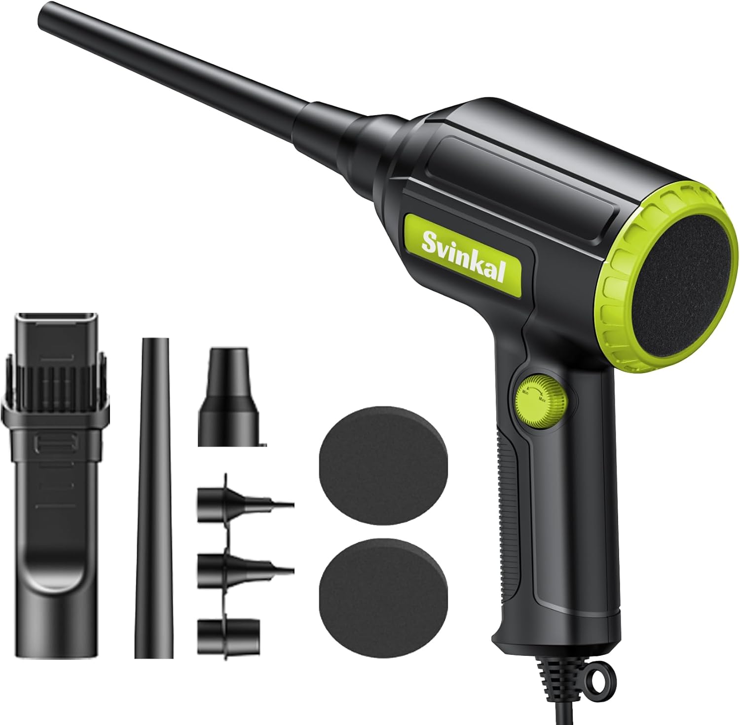 - The air duster has a【gun-shaped design】 that is non-slip and easy to grip. Anti-folding cable protection buckle can effectively protect the cable. Comes with a round hanging loop for easy storage on a hook. Includes two air filters that can be easily removed from the unit for replacement